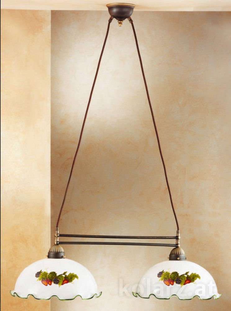 Závěsné retro svítidlo ze série NONNA s pečlivě propracovanými kovovými prvky v barvě staré mosazi.Skleněné stínidlo nejvyšší jakosti je ozdobeno okouzlujícími dekoracemi v podobě ovoce a spodní linie.Pro osvětlení chalupy, chaty i stylové restaurace doporučujeme harmonické svítidla Kolarz Nonna.Jedinečný rustikální prvek stylového interiéru. Ručně zdobené osvětlení. Vyrobeno v EU.Do svítidel doporučujeme retro LED žárovky Filament, nejsou součástí produktu.Specifikace:2 x 75W E27Šířka:64 cmVýška stínidla:21 cmCelková výška:100 cmMateriál, barva:kov, sklo, dekor ovoce, antická mosaz,