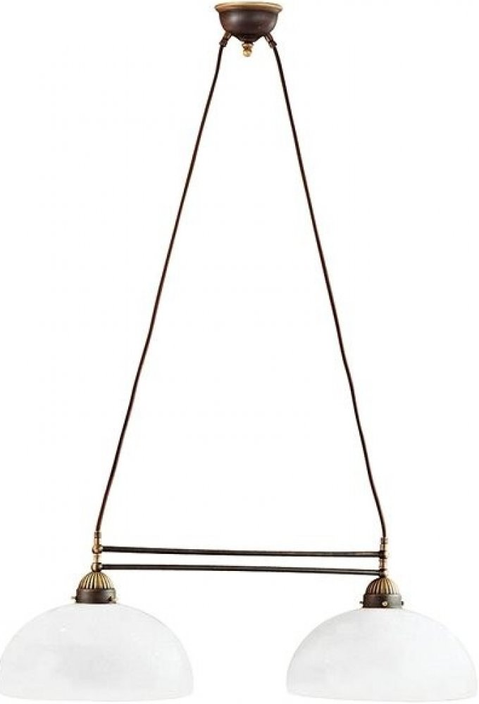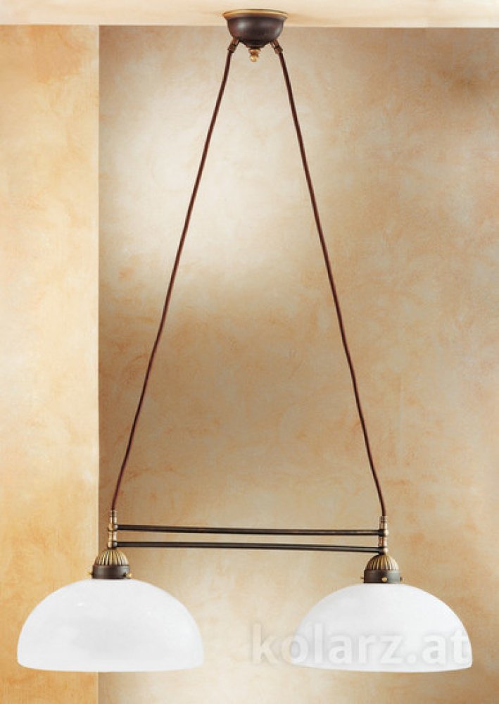 Rustikální závěsné svítidlo ze série Kolarz Nonna vás uchvátí pečlivě kovovými prvky v barvě staré mosazi.Bílá skleněná stínidla nejvyšší jakosti jsou zavěšena na kabelech potažených hnědou látkou.Pro osvětlení chalupy, chaty i stylové restaurace doporučujeme tato harmonické svítidla z kolekce Kolarz Nonna.Jedinečný rustikální prvek stylového interiéru. Prohlédněte si také další typy osvětlení Kolarz NONNA nebo retro svítidla.Do svítidel doporučujeme retro LED žárovky Skylighting s paticí E27. Žárovky nejsou součástí svítidla.Specifikace:2 x 75W E27Šíře:75 cmVýška stínidla:25 cmCelková výška:175 cmMateriál, barva:kov, antická mosaz, sklo, kabel s textilií