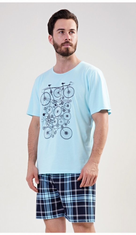 Pánské pyžamo šortky Kolo. Pánské pyžamo se skládá z trička s krátkým rukávem a krátkých šotkových kalhot. Na tričku je obrázek kola v několika opakováních. Tričko doplňují kárované kalhoty. Použitý materiál je jemný a poddajný na dotek. Pyžamo je vhodné na denní nošení. Pokyny pro údržbu: