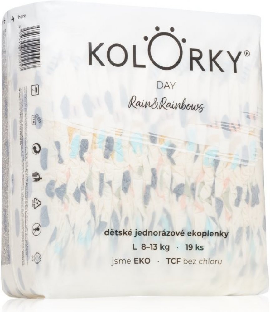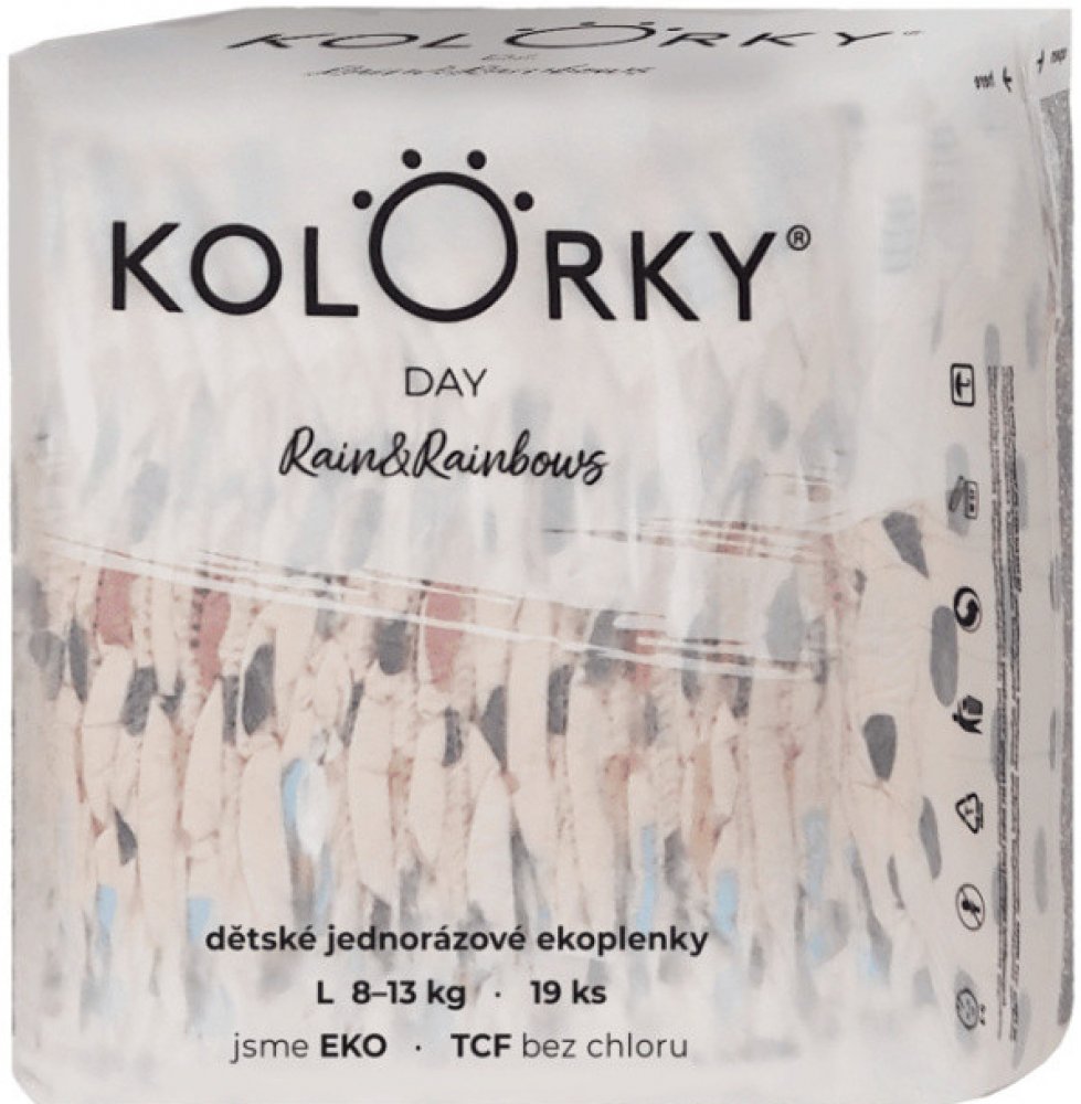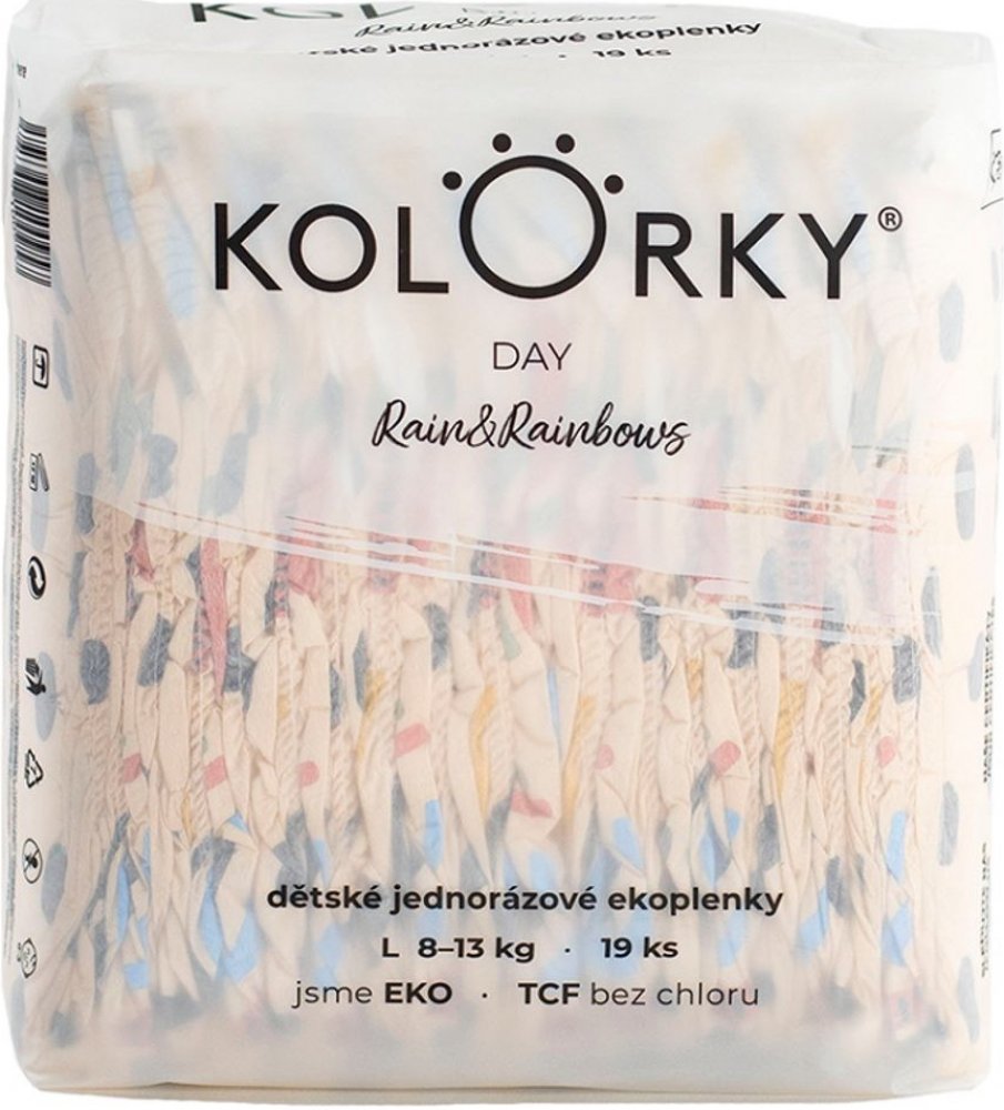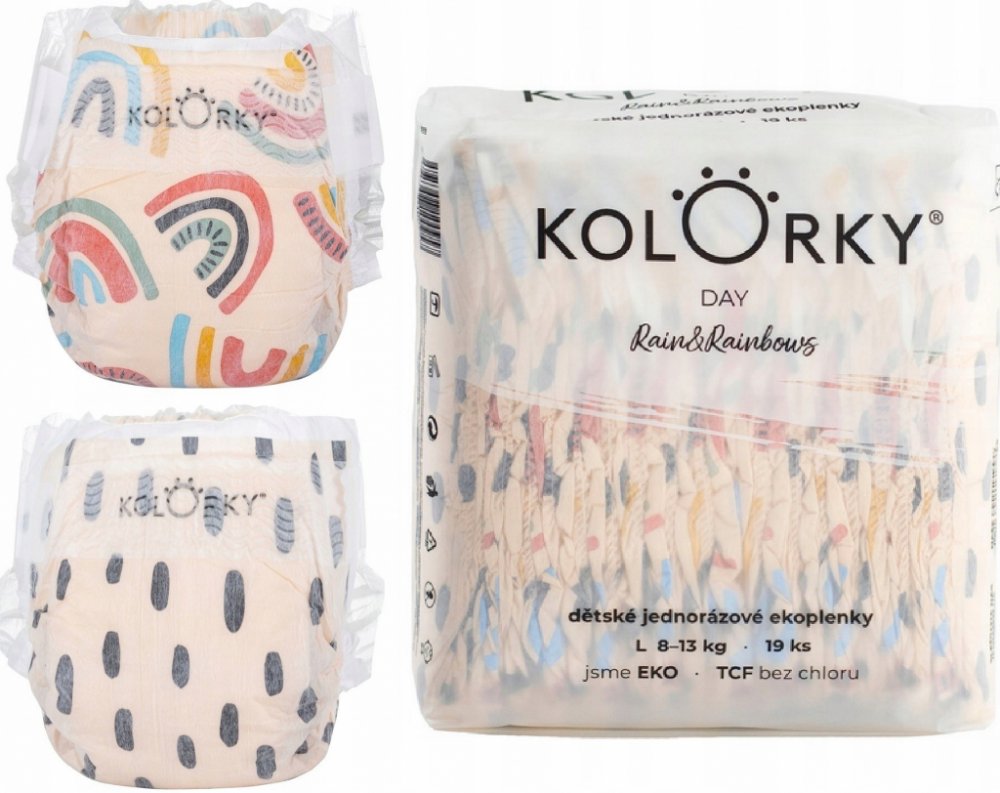 Plenky KOLORKY DAY jsou určeny pro běžné denní nošení. Myslí na zdraví vašeho miminka, přírodu kolem sebe a design, který udělá i z přebalování hezkou chvilku. KOLORKY jsou vyrobeny z přírodních a obnovitelných materiálů, neobsahují parfémy, ftaláty ani jiné škodlivé látky. Navíc jsou běleny zcela bez použití chloru metodou TCF (total chlorine free). Díky použitým materiálům, zpracování a pečujícím proužkům z přírodní Aloe vera, jsou šetrné k jemné pokožce miminek. Plenky jsou základem šatníku všech miminek a barevné designy tak podtrhnou jejich styl. Plenky jsou vyvinuty v ČR, dermatologicky testovány a certifikovány Státním zdravotním ústavem - SZÚ.