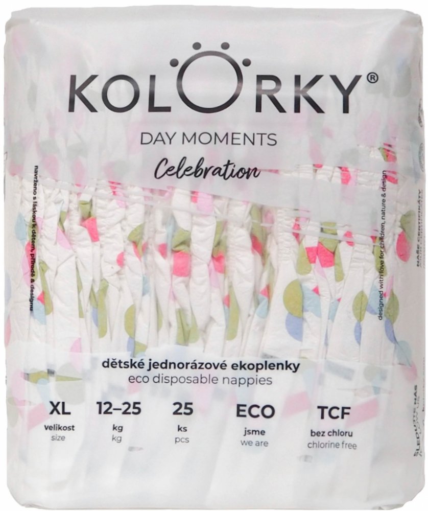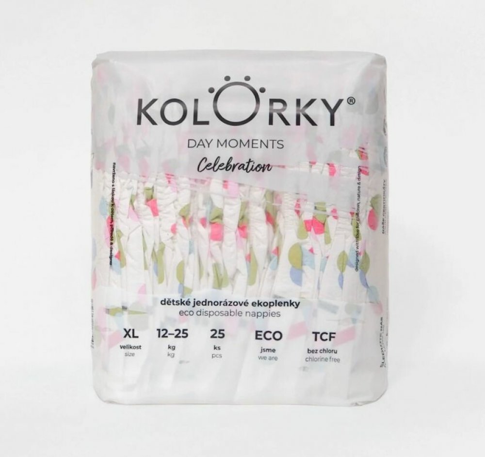 KOLORKY DAY MOMENTS jsou velmi tenké a jsou určeny pro každý moment s vašimi nejmenšími. Díky svému střihu neomezují miminko v pohybu. Jsou vyrobeny z přírodních a obnovitelných materiálů, neobsahují parfémy, ftaláty ani jiné škodlivé látky. Technologie Flash dry, zaručuje, že tekutina je rychle odvedena od pokožky miminka a pevně uzamyká v jádru nejen tekutiny, ale i zápach. Absorpční kanálky navíc zajišťují, že se tekutina rovnoměrně rozprostře po celém savém jádru a nehromadí se na jednom místě. Plenky mají také indikátor vlhkosti, který vám napoví, že je miminko potřeba přebalit. Design je plný barevných konfet a nese název Celebration, protože každý moment s vaším dítětem si zaslouží oslavit.