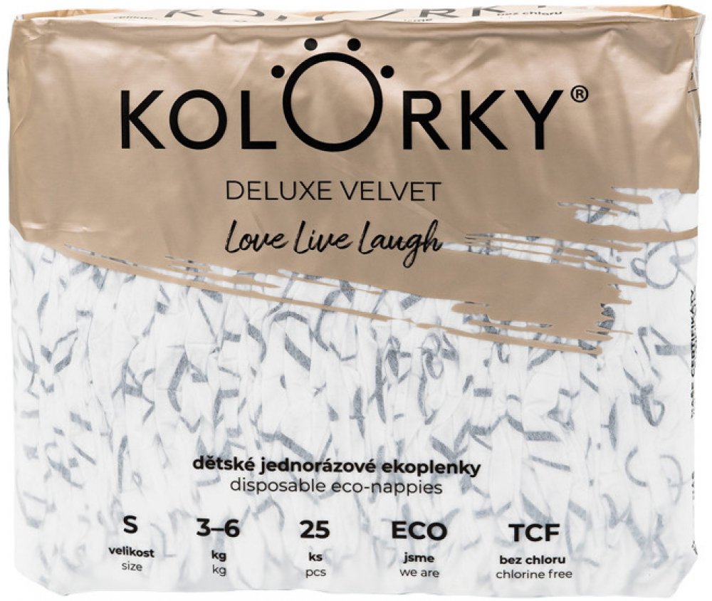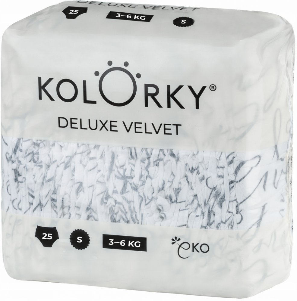 velikost S 25 ks 3-6 kgKolorky DELUXE VELVET jsou na jedno použití plenky pro nejmenší.Jsou mimořádně jemné, měkké, vzdušné a savé.