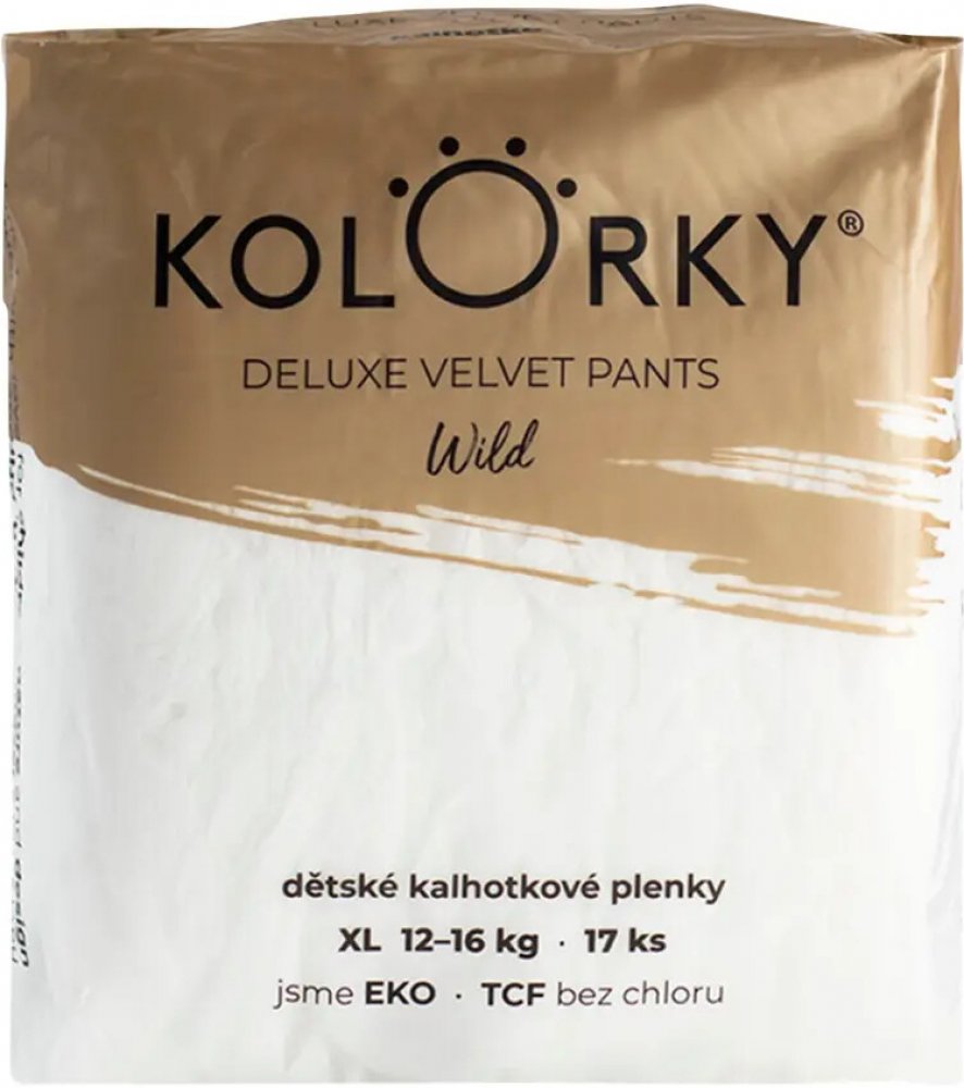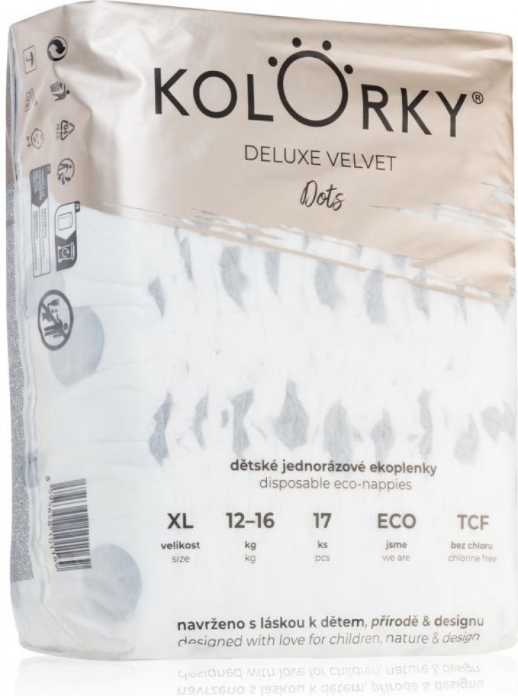 KOLORKY DELUXE VELVET jsou unikátní svým sametovým povrchem, který přináší vašemu miminku ještě příjemnější pocit z nošení plenek. Díky indikátoru vlhkosti přesně poznáte, kdy je potřeba miminko přebalit. KOLORKY jsou eko, protože jsou vyrobeny z přírodních a obnovitelných materiálů, neobsahují chlor, ftaláty, latex ani parfémy, takže nedráždí citlivou dětskou pokožku a nevyvolávají alergie. Plenky jsou navrženy tak, aby se miminku co nejlépe přizpůsobily, nikde netlačily, byly prodyšné a vše zůstalo na svém místě. Savé jádro, které je tvořeno vrstvou buničiny a SAP gelu, pevně uzamyká tekutiny i zápach. KOLORKY tak odvedou vlhkost rychle pryč a zanechají dětskou pokožku suchou a klidnou. Všechny plenky jsou dermatologicky testovány a certifikovány Státním zdravotnickým ústavem - SZÚ. XL Velikost 12 – 16 kg Hmotnost dítěte 17 ks Počet ks v balení Klíčové vlastnosti...
