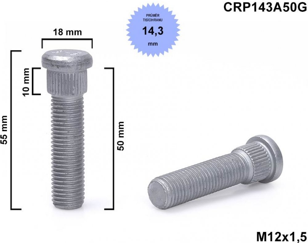 Pevnostní kolové svorníky – štefty M12x1,5×50 mm s tisícihranem o průměru 14,3 mm typ CRP143A55G prodloužené pro montáž rozšiřovacích podložek. Vhodné pro značky automobilu Citroën, Dodge, Fiat, Hyundai, Kia, Lexus, Mazda, Mitsubishi, Peugeot, Subaru, Toyota.