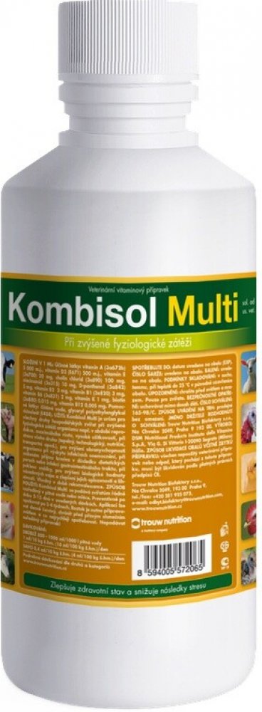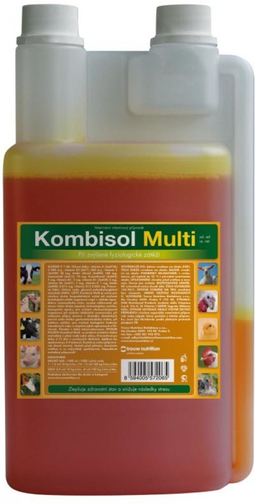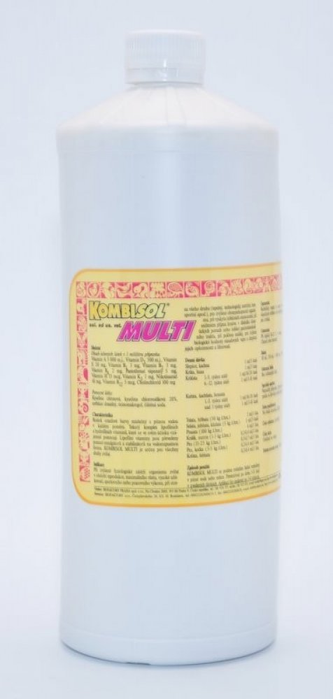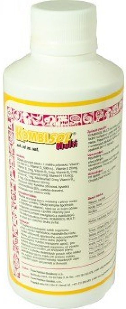 doplňuje potřebné vitaminy, zlepšuje kondici zvířat, napomáhá při vyrovnání s následky stresu, při poklesu užitkovosti. Při zvýšené fyziologické zátěži dochází v organismu k porušení vnitřního prostředí a jsou zahájeny metabolické procesy, které vedou k obnovení rovnovážného stavu. Mnohé pochody jsou řízeny hormony, které vyžadují pro svoji syntézu vitaminy. Z těchto důvodů nedostatečná hladina vitaminů snižuje efektivitu tohoto procesu. Kombisol Multi je určen pro všechny druhy hospodářských zvířat při zvýšené fyziologické zátěži např. v období reprodukce, maximálního růstu, vysoké užitkovosti nebo stresu (tepelný, technologický, nutriční, transportní a pod.). Vzhledem k jednotlivým účinkům vitaminů napomáhá Kombisol Multi obranyschopnosti organismu, rekonvalescenci, podporuje příjem krmiva i v době dietetických poruch nebo infekcí gastrointestinálního traktu. Zvyšuje biologickou hodnotu násadových vajec, oplozenost a líhnivost. Složení v 1 ml: Vitamin A 5 000 m.j., vitamin D3 500...