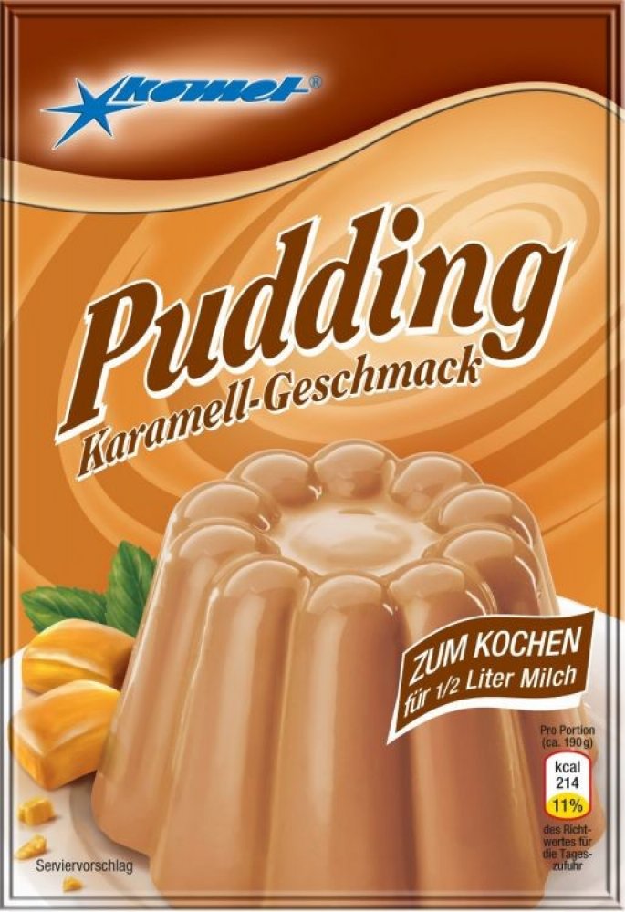 Naše kometové pudinky jsou k dispozici v 15 lahodných variantách a nabízejí mnoho možností pro vaše nápadité dezerty, pro přípravu koláčů, dortů, plnění pralinek a mnoho dalšího.Krémově aromatická receptura dělá z našeho pudinku Komet s malinovou příchutí lahodný dezert.Obsah: 40 gna 1/2 litru mléka.Stále přidáváte500 ml mléka40 gramů cukrupřísadškrob, aroma, karamelizovaný cukr, jedlá sůl.Může obsahovat stopypšenice, lískových ořechů, mlékaa sušenýchcelýchvajec.Nutriční hodnoty pudinkNa 100 gCca 190 g na porciProcento porceenergie473 kJ/ 113 kcal899 kJ/ 214 kcal11 Tuk (včetně nasycených tuků)3,4 g (2,2 g)6,5 g (4,1 g)9 (20 )sacharidy z toho cukry)17,2 g (11,3 g)32,8 g (21,5 g)13 (24 )protein3,0 g5,6 g11 sůl0,14 g0,27 g5 Pudink připravený s mlékem 3,5 tuku a 40 g cukru tvoří 3 porce a obsahuje v průměru:Referenční množství pro průměrného dospělého (8400 kJ/2000 kcal).Nutriční hodnoty pudinkového práškuNa 100 gv balení (40g)energie1465 kJ/ 345 kcal586 kJ/ 138 kcalTuk (včetně nasycených tuků)0 g (0 g)0 g (0