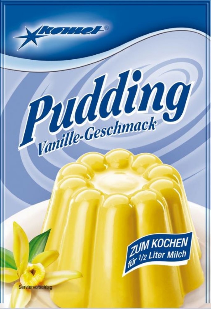 Naše kometové pudinky jsou k dispozici v 15 lahodných variantách a nabízejí mnoho možností pro vaše nápadité dezerty, pro přípravu koláčů, dortů, plnění pralinek a mnoho dalšího.Krémově aromatická receptura dělá z našeho pudinku Komet s vanilkovou příchutí lahodný dezert.Obsah: 40 gna 1/2 litru mléka.Stále přidáváte500 ml mléka40 gramů cukrupřísadŠkrob, aroma, jedlá sůl, barviva: riboflaviny, annattonorbixin.Může obsahovat stopypšenice, lískových ořechů, mlékaaobsaženýchcelých vajec.Nutriční fakta pudinkNa 100 gCca 190 g na porciNa procento porce energie473 kJ / 112 kcal898 kJ / 214 kcal11 Tuky (z toho nasycené mastné kyseliny)3,4 g (2,2 g)6,5 g (4,1 g)9 (20 )sacharidy z toho cukry)17,2 g (11,3 g)32,7 g (21,5 g)13 (24 )protein3,0 g5,6 g11 sůl0,16 g0,30 g5 Pudink z mléka 3,5 tuku a 40 g cukru tvoří 3 porce a obsahuje v průměru: Referenční příjem pro průměrného dospělého (8400 kJ / 2000 kcal).Nutriční hodnoty pudinkový prášekNa 100 gv balení (40g)energie1464 kJ / 344 kcal585 kJ / 138 kcalTuky (z toho nasycen