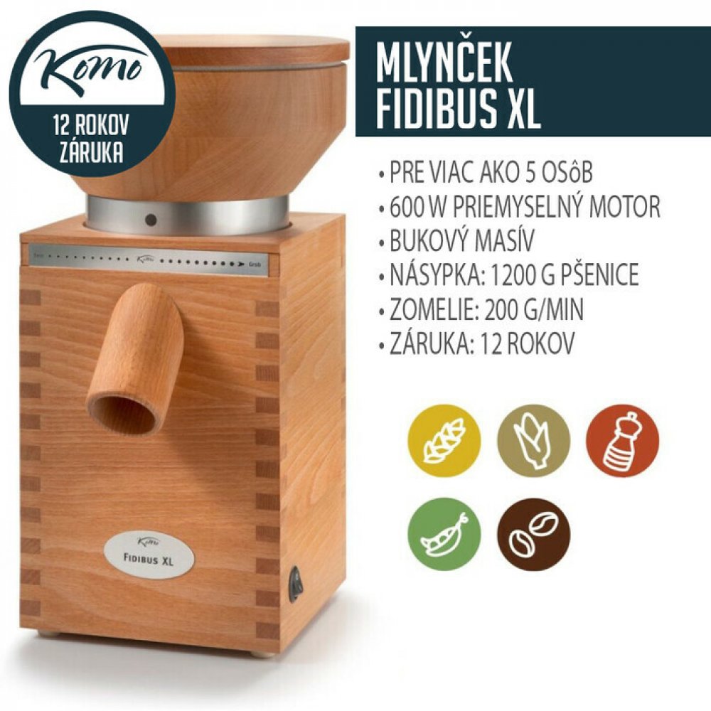 Mlýnek KoMo Fidibus XL s výkonem 600 wattů je vhodný pro domácnosti do 5 osob. Pracuje dvakrát rychleji, než mlýnky s výkonem 360 W.Průměrná rychlost mletí je 200g jemné mouky za minutu.