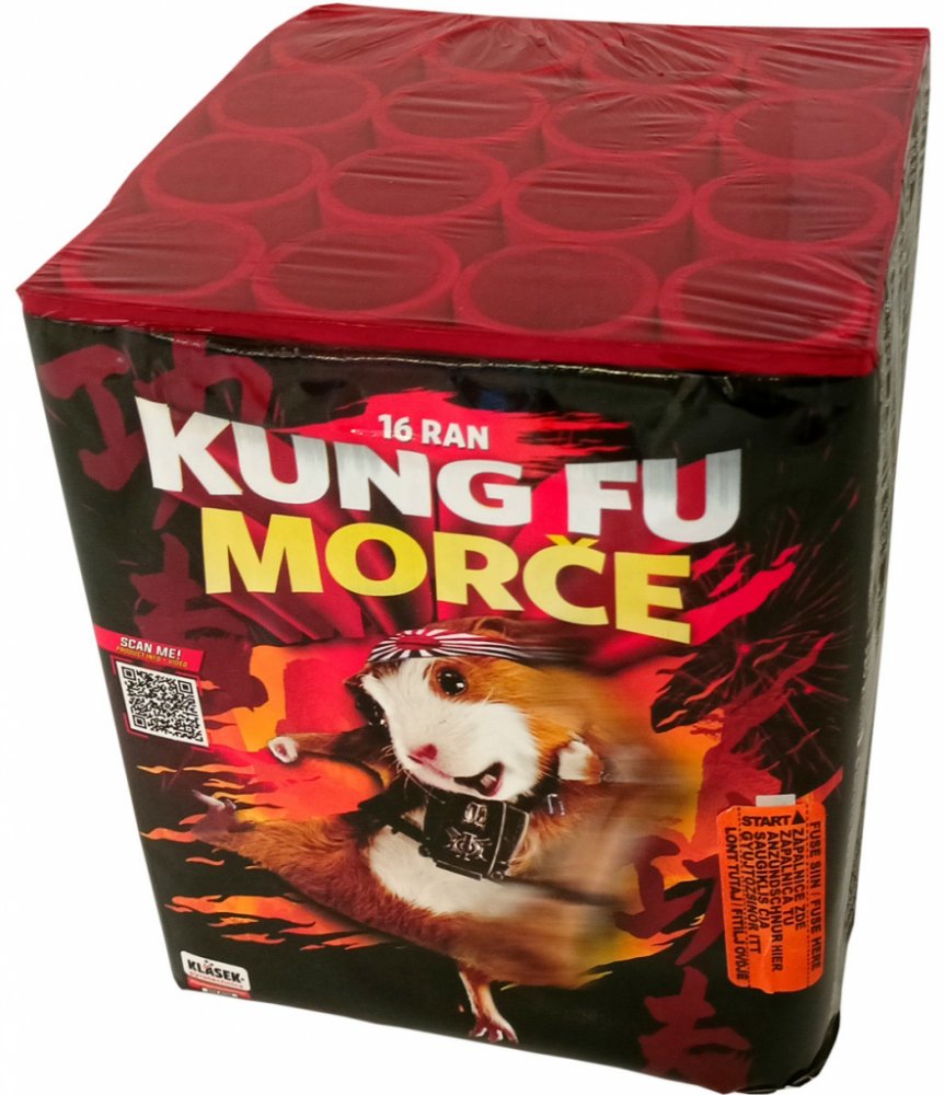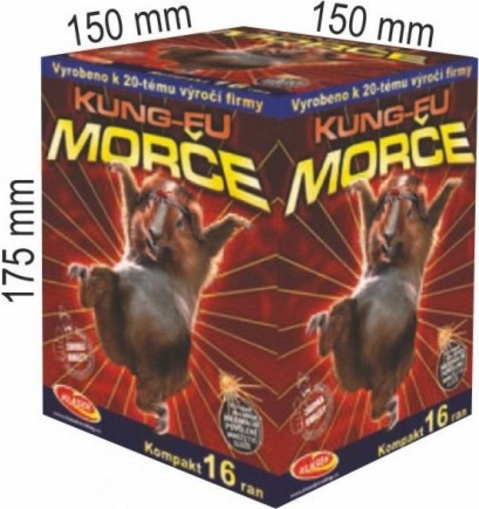 Ohňostrojový kompakt Kung-fu Morče má tvar kvádru. Uvnitř kompaktu jsou uloženy trubice s jednotlivými ranami.
