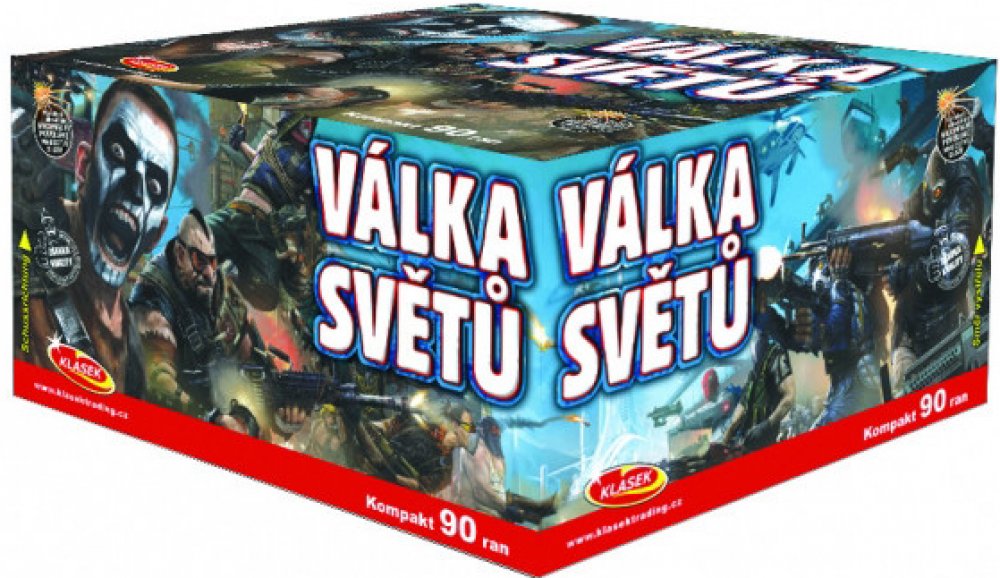 Kompaktní ohňostroj VÁLKA SVĚTŮ ráže 20mm s 90 ranami, se řadí do 3. kategorie je volně prodejný od 21 let. Kompaktní ohňostroj VÁLKA SVĚTŮ obsahuje mix 10 různobarevných efektů s finále - více ran najednou. Detail efektu a barevnosti ohňostroje VÁLKA SVĚTŮ, můžete shlédnout v záložce VIDEO.