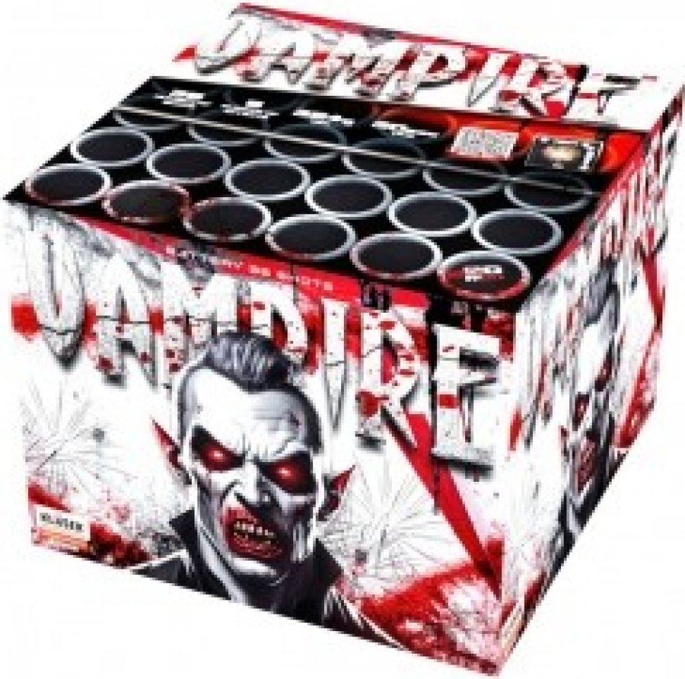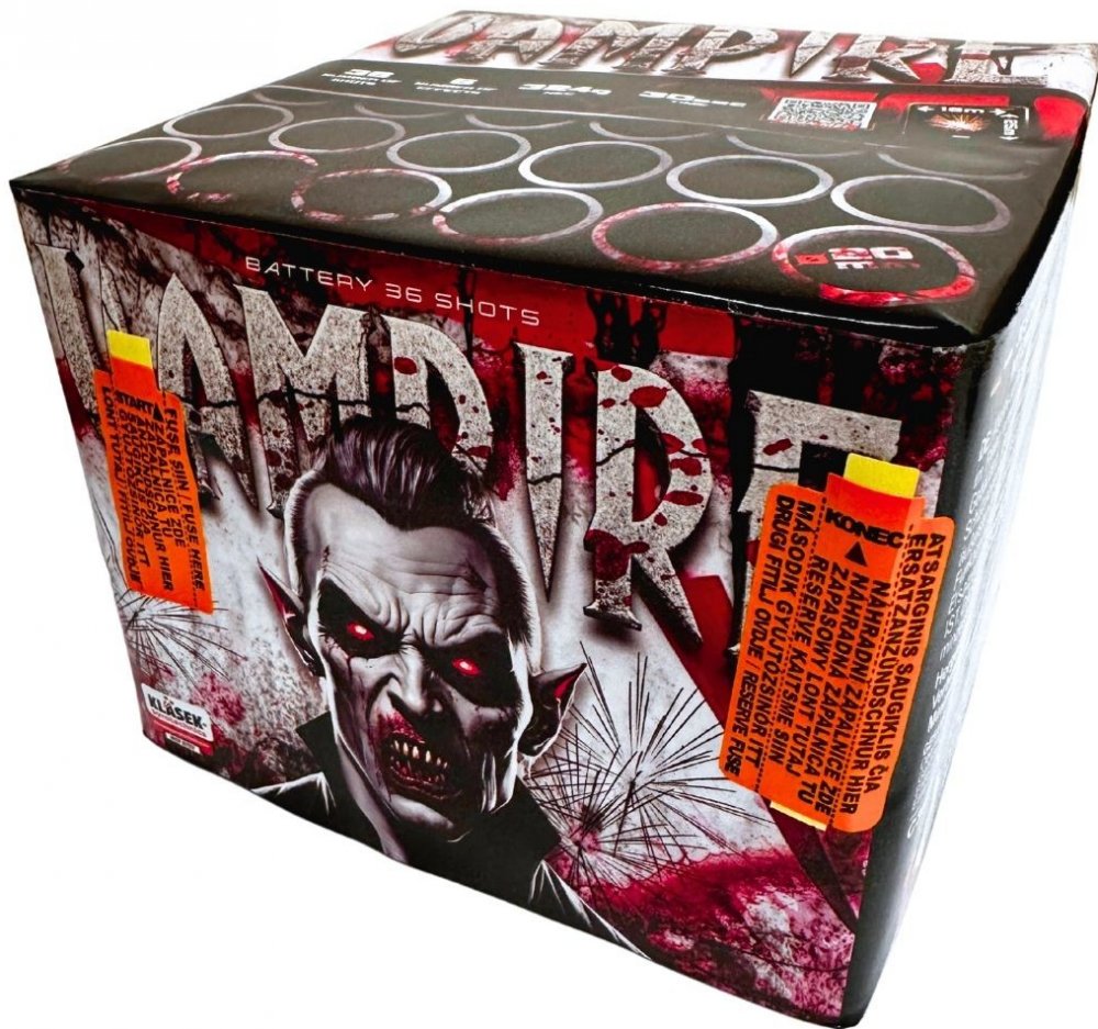 Pyrotechnika Kompakt 36 ran/20 mm VampireJedná se o kompakt ve tvaru krychle, uvnitř kterého jsou uloženy jednotlivé rány.Kompakt umístěte na rovnou a pevnou podložku.Následně během tří až šesti sekund po zapálení zápalnice kompaktu začnou vystřelovat do výšky cca 15 až 50 metrů (dle ráže) efekty. Efekt: mix 5 různých efektů, finálePočet ran: 36.Průměr moždíře: 20 mm.Doba trvání efektu: 30 s.Třída nebezpečí: Kategorie F2ADR zařazení: 1.3G Bezpečnostní pokyny: kompakt musí stát na rovné, pevné a nehořlavé podložce. Je vhodné kompakt ukotvit. Při zapalování se nikdy nenaklánějte nad výmetnou část kompaktu. Po zapálení odstupte alespoň o 10-20 metrů. Vždy postupujte podle návodu na výrobku!