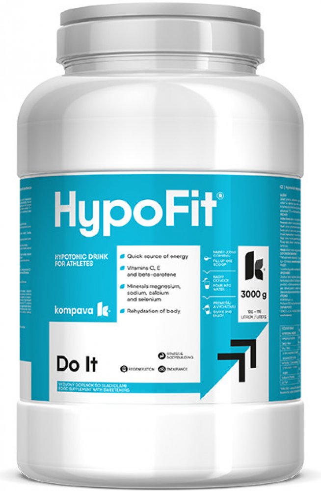 HypoFit je určen k rehydrataci organismu. Poskytuje rýchlodostupný zdroj energie v podobě glukózy a maltodextrinu, zároveň obsahuje vitaminy C, E, beta-karoten a selen, které mají silný antioxidační účinek, zabraňují působení škodlivých volných radikálů. Extrakt zeleného čaje povzbuzuje centrální nervový systém a činnost mozku, čímž dochází k odstranění projevů únavy.Účinné látky:sacharidy - slouží jako okamžitá energie pro svaly, mozek a krvinkyantioxidanty - chrání před působením volných radikálůminerály - působí proti vzniku křečí ve svalechelektrolyty - udržují optimální rovnováhu tělních tekutinselen - optimalizuje činnost srdce, přispívá ke správnému fungování imunitního systému ak ochraně buněk před oxidativním stresemurčený:Pro tréninky s dlouhotrvajícím zatíženímPro sportovní disciplíny s velkým objemem pohybové aktivityPro sporty vytrvalostního charakteruvýhody:Celková rehydratace organismuPosílení obranyschopnosti organismuVhodný pro děti od 8 letDávkováníRozmíchejte 6 g prášku (1 odměrku) v 250 ml vody. Maximální denní dávka je 1,5 l nápoje.užívejte:před sportovním výkonem: 0,6-1 lběhem sportovního výkonu: v malých množstvích 0,3-0,5 l nápoje, max. 1 lv průběhu 1 hodinypo sportovním výkonu: na regeneraci a rehydrataciTabulka nutričních hodnotVelikost jedné dávky:6 gPočet dávek v balení: (3000 g)500hodnoty:ve 100 gv 6 gEnergetická hodnota1 289,8 kJ / 303,6 kcal77,39 kJ / 18,22 kcaltuky0,12 g0,01 gz toho nasycené mastné kyseliny0,11 g0,01 gsacharidy74,9 g4,5 gz toho cukry39,12 g2,35 gbílkoviny0,51 g0,03 gsůl0,22 g0,01 gMinerální látky:Na (sodík)1,2 g72 mgCa (vápník)505 mg30,3 mgK (draslík)633 mg38 mgMg (hořčík)197 mg11,8 mgSe (selen)200 mikrogramů12 mikrogramůvitamíny:vitamín C180 mg10,8 mgvitamín E61,3 mg3,7 mgBeta-karoten1,4 mg8 4 mikrogramůSloženíGlukóza, maltodextrin, regulátor kyselosti kyselina citrónová, extrakt ze zeleného čaje, mléčnan vápenatý, citran sodný, mléčnan hořečnatý, sůl, citran draselný, sladidlo aspartam, vitamíny: C - kyselina l-askorbová, E (DL-α-tokoferylacetát), kvasničný selen, příchuť citrón + limetka: aroma citronová, limetková, příchuť exotic: aroma exotic, barvivo betakaroten, příchuť grep: aroma grapefruitová, přírodní hořký extrakt naringin, příchuť jablko-limetka: aroma jablečná, limetková, příchuť pomeranč: aroma pomerančová, barvivo betakaroten , příchuť višeň: přírodní barvivo extrakt z ovocného čaje, aroma višňová, příchuť černý rybíz: přírodní barvivo extrakt z ovocného čaje, aroma černý rybíz.UpozorněníObsahuje zdroj fenylalaninu. Nevystavujte přímému slunečnímu světlu. Nevhodný pro děti do 7 let. Skladujte mimo dosah malých dětí, v suchém prostředí, v dobře uzavřeném obalu, při teplotě do 25 ° C. Nepoužívejte jako náhradu pestré a vyvážené stravy a zdravého životního stylu. Stanovená doporučená denní dávka se nesmí přesáhnout.