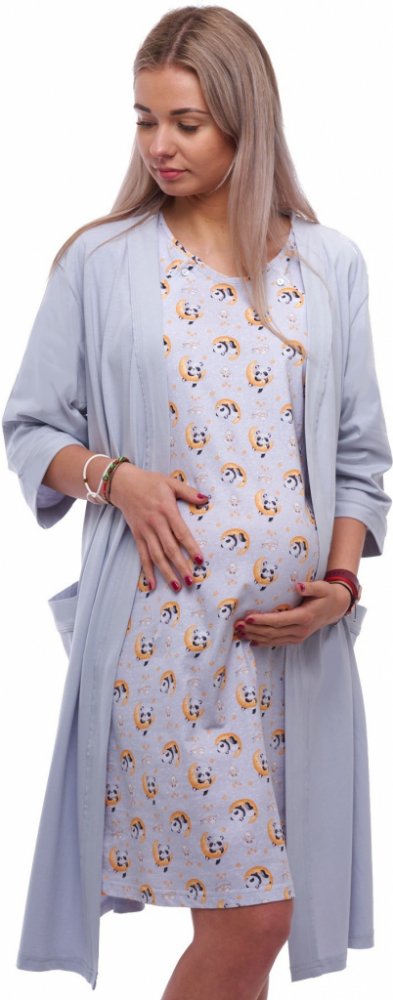 Komplet bavlněná noční košilka s pandami a šedý župan ideální pro těhotenství kojení i do porodnice 1G0707 šedá