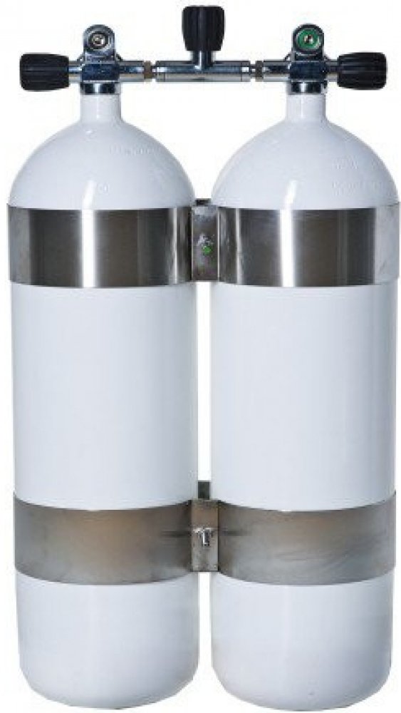 Sestava TWIN obsahuje 2 x 12 litrové láhve o průměru 171 mm, dále kompletní uzavíratelný manifold a ocelové skruže.