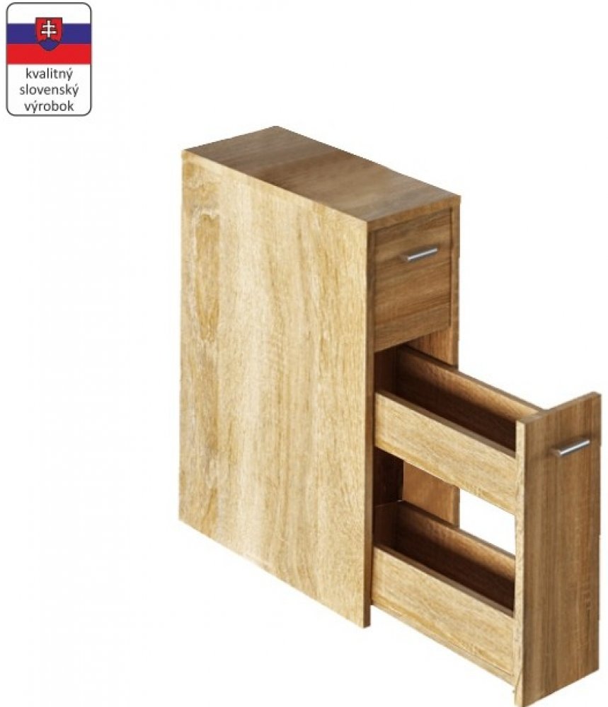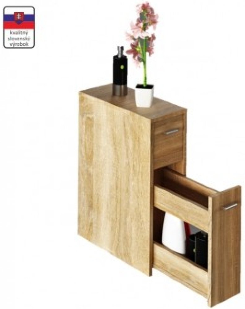 Koupelnová skříňka NATALI TYP 7 z lamina v dekoru dub sonoma. Díky této skříňce získáte praktický prostor pro uložení čistících prostředků. Skříň slovenské výroby má 2 zásuvky. Co nechcete, aby bylo na očích jednoduše ukryjete. Dodáváme v demontu. Rozměry: - šířka 20 cm - hloubka 45 cm - výška 61 cm