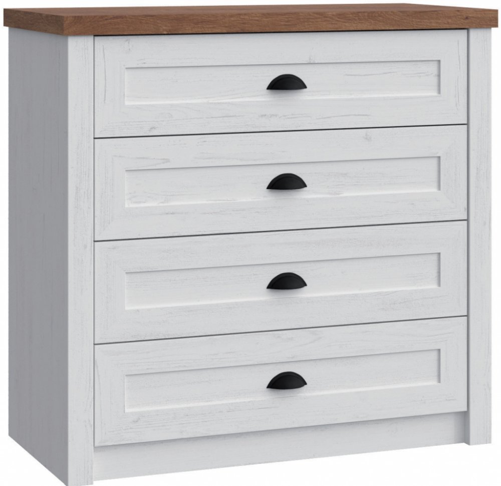 Komoda z luxusní kolekce nábytku, která je inspirovaná nezaměnitelným venkovským stylem jihovýchodní Francie. Dopřejte si luxus a nádech historie i u vás doma. S kolekcí Provence se váš interiér stane útulným domovem. Kombinace bílého dekoru borovice andersen s tmavým dubem lefkas propůjčují nábytku svěží a lehký vzhled. Jedinečný design je sklouben s vysokou funkčností, takže se nemusíte bát, že váš nový nábytek bude pouze na ozdobu. Každá skříňka nabízí dostatek úložného prostoru, kam umístíte všechny potřebné věci. Originální kovové úchytky dokreslují venkovský charakter nábytku. Ponořte se do kouzelného světa trubadúrů a jejich milostných písní, kterými je oblast Provence vyhlášená. S kolekcí nábytku Provence bude váš domov útulným a hřejivým místem odpočinku. Komoda K4 disponuje 4 zásuvkami a vyrábíme ji z kvalitního lamina o síle 15 mm, vrchní deska o síle 36 mm, dvířka a čela zásuvek z MDF o síle 18 mm. Dodáváme v demontu. Komoda K4 je jedním z prvků kolekce Provence. Podívejte se na nabídku dalších komponentů a vytvořte si obývák nebo jídelnu přesně dle vašich představ.