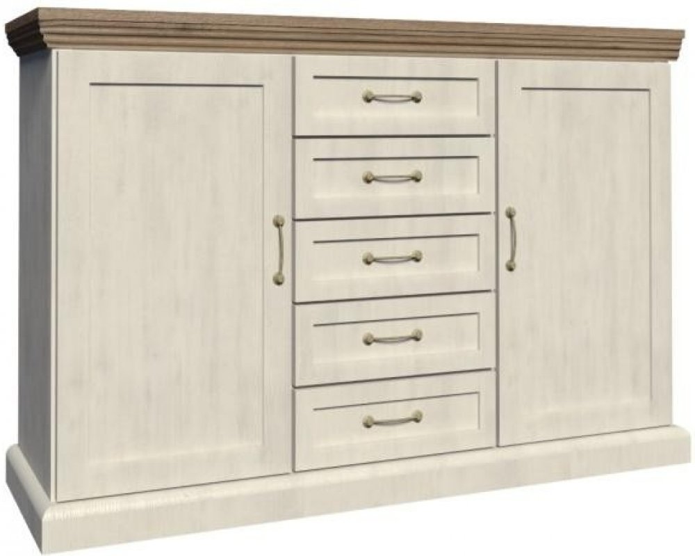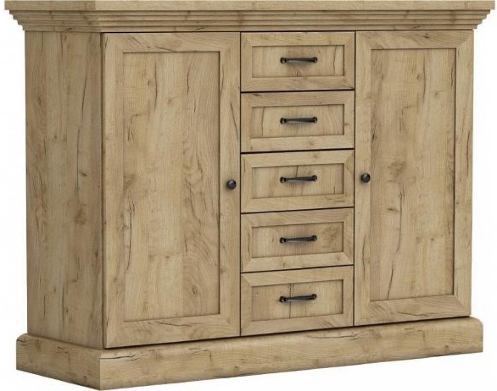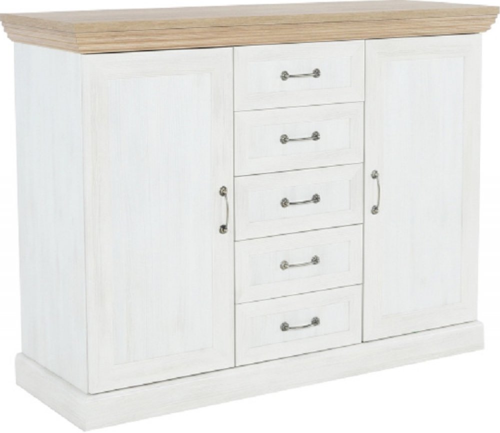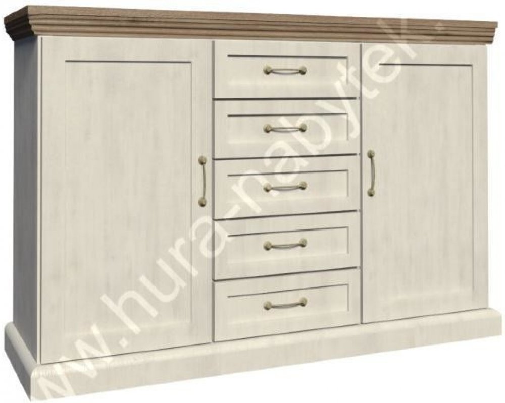 Provedení: Dvoudveřová komoda s pěti zásuvkami z kompletu ROYAL.