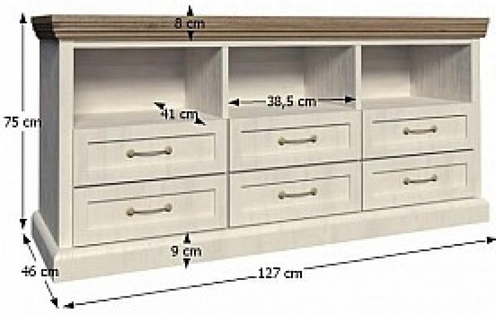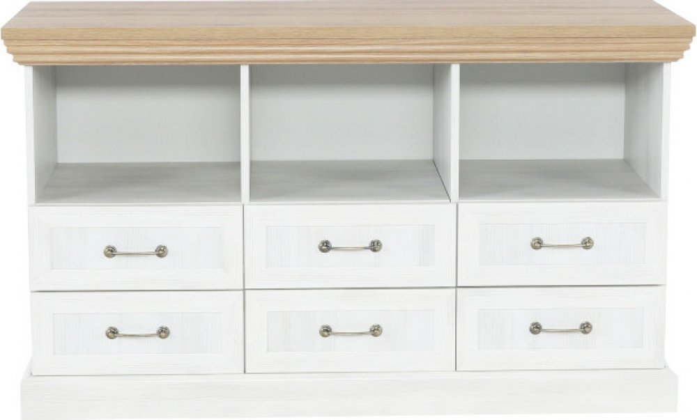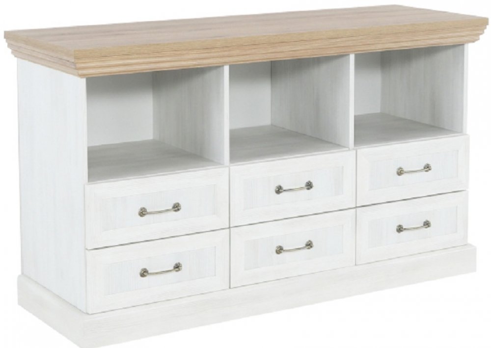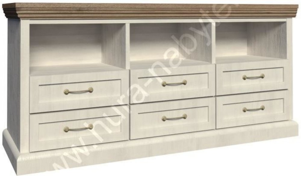 TV stolek Royal v anglickém stylu bude nejen ozdobou vašeho obývacího pokoje, ale hlavně praktickým doplňkem. Má tři úložné poličky a šest zásuvek. Vrchní část stolku má ozdobnou vyřezávanou lištu a zásuvky mají kovové úchyty. Je v barevném provedení bílá sosna nordická v kombinaci s dubem divokým.