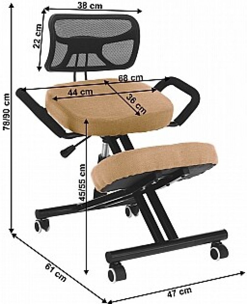 Klekačka má kovovou konstrukci v černé barvě a je čalouněna do látky. Součástí síťovaného opěráku je i bederní opěrka. Klekačka také nabízí opěrky na ruce. Mobilitu židle zajišťují pogumovaná kolečka, která jsou vhodná na tvrdé povrchy.