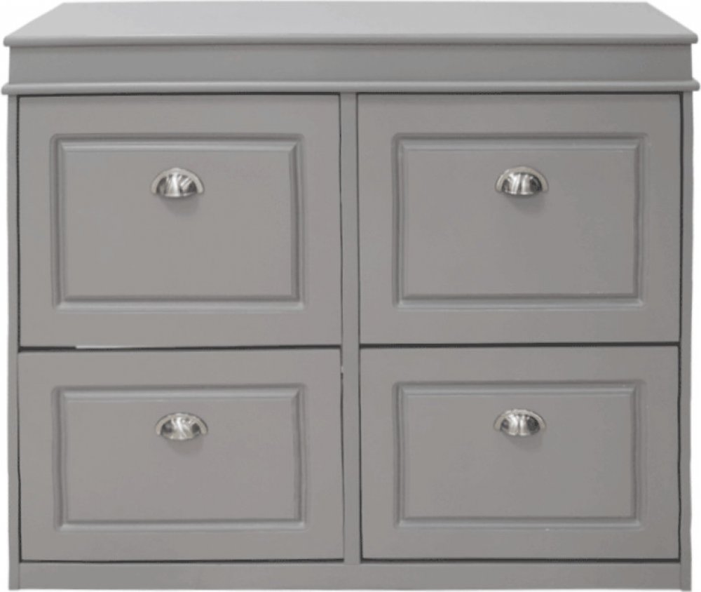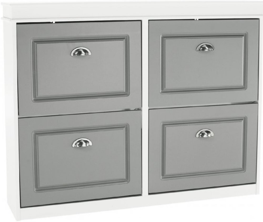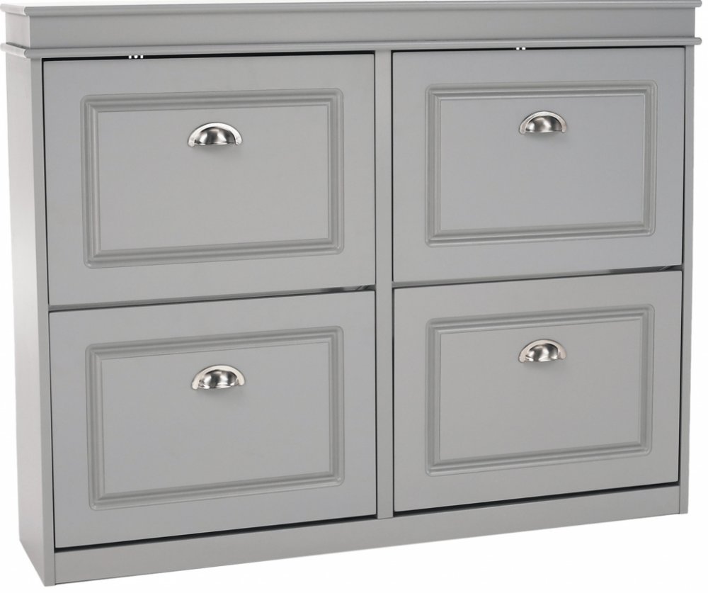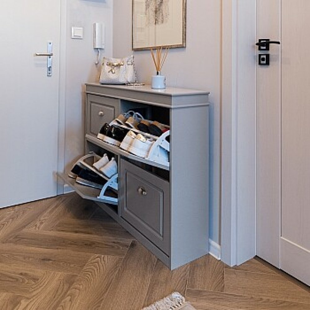 Dvě výklopné přihrádky umožňují snadný a přehledný přístup k botám, zatímco pevná konstrukce z MDF a dřevotřísky zaručuje stabilitu a dlouhou životnost. Elegantní šedé provedení se snadno kombinuje s dalšími kusy nábytku.