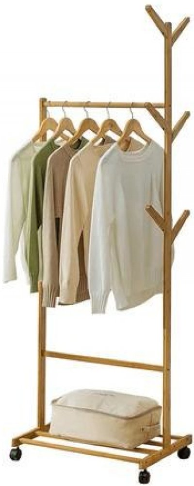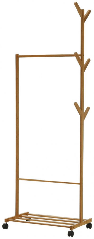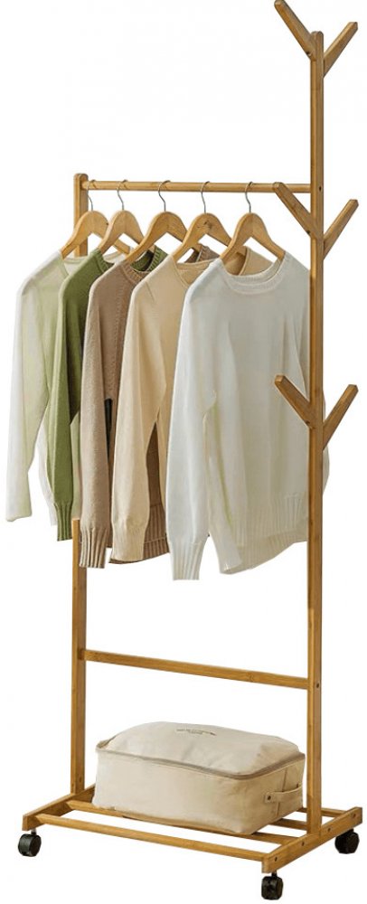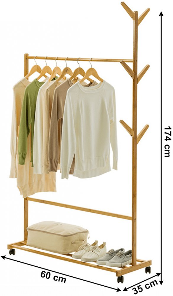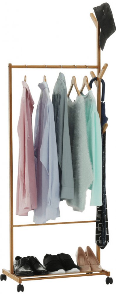 Pojízdný věšák VIKIR 1 je vybaven spodní bambusovou policí a věšákovou tyčí. Díky 6 háčkům na doplňky jednoduše uložíte i deštníky. Praktická kolečka dopomohou k plné mobilitě organizéru.