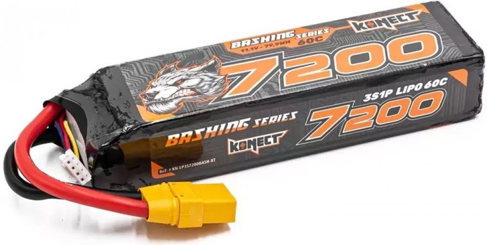KONECT LiPo 7200mah 11.1V 60C 3S1P 79,90Wh, XT90 konektor KONECT. RC baterie. KONECT LiPo s XT-90 konektorem a XH balančním konektorem, kapacita 7200mAh, 60C vybíjecí proud (krátkodobě 120C), napětí 11,1V/3S, délka: 149mm, šířka: 43mm, výška: 30,0mm, váha: 470g.