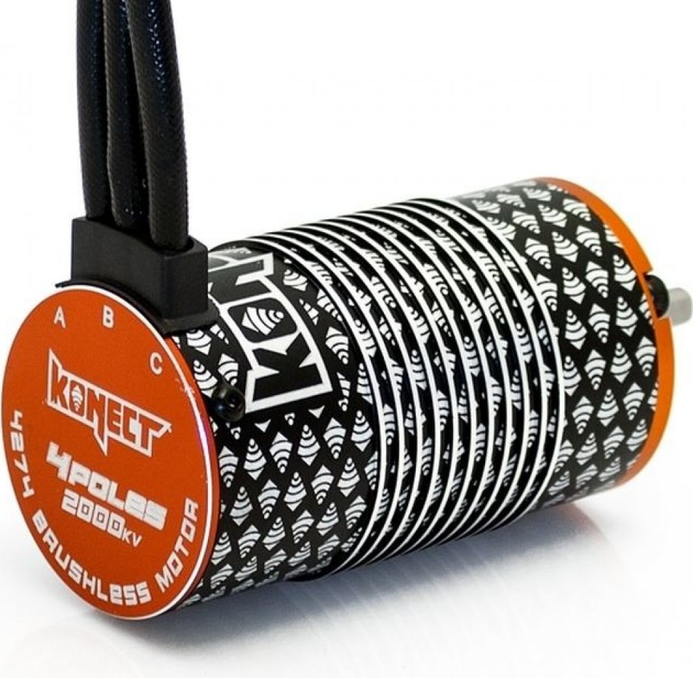 KONECT střídavý motor 4274SL 2000kV KONECT. příslušenství k modelům. Čtyřpólový bezsenzorový střídavý elektromotor pro RC auta v měřítku 1:8. Napájení: 2–6S LiPo, průměr hřídele: 5 mm, délka motoru: 74 mm, průměr motoru: 42 mm, hmotnost: 412 g.