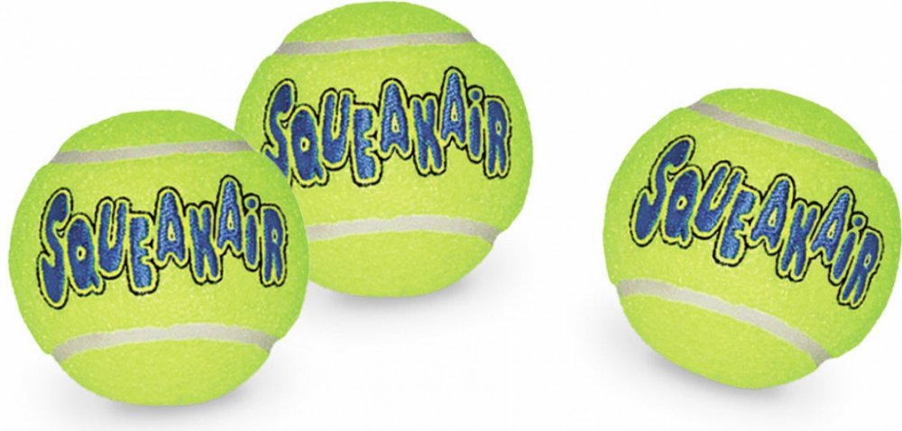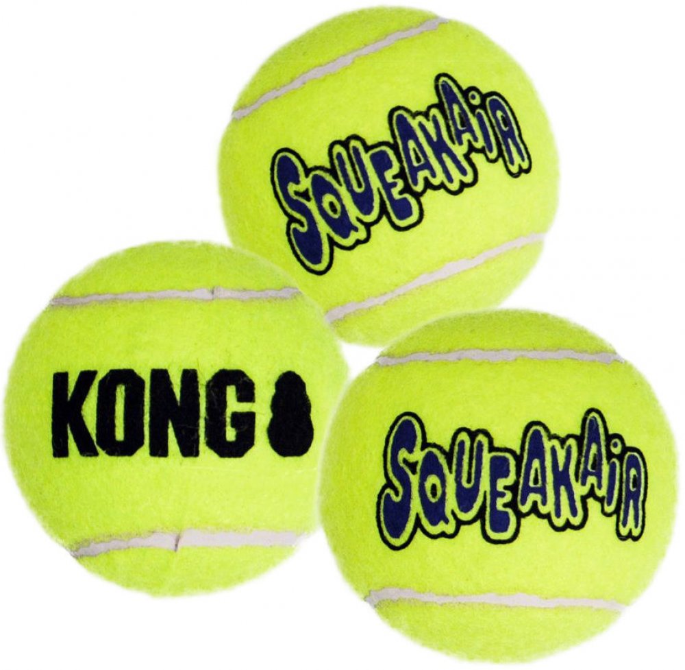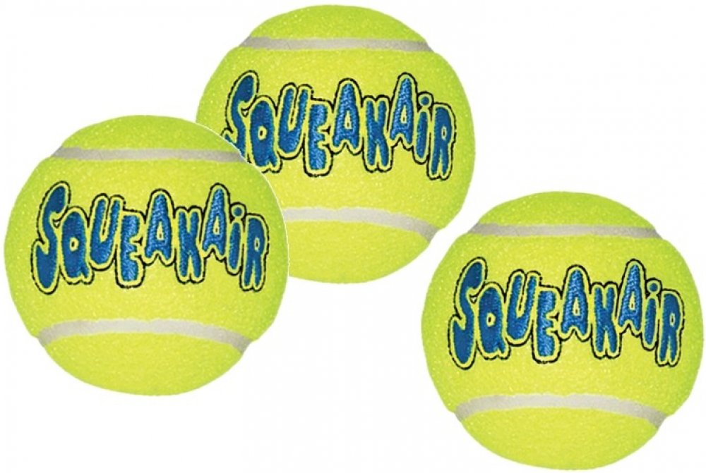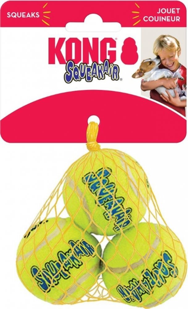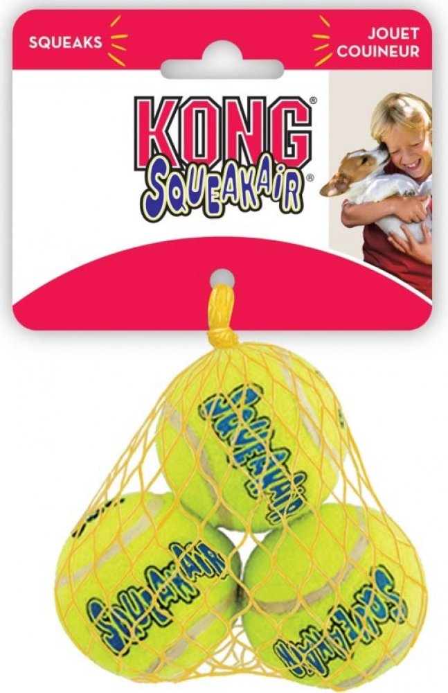 Jedna z nejoblíbenějších hraček u psů malých plemen – tři malé tenisové míčky KONG SQUEAKAIR, které navíc pískají.