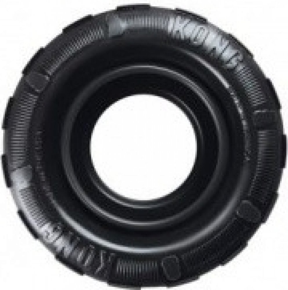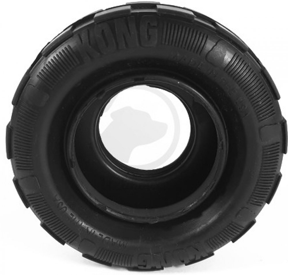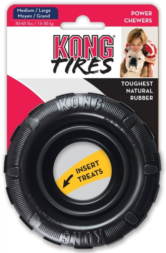 Hračka KONG Tires Pneumatika je hračka pro psy ze speciální odolné gumy. Je vyrobena z ultra elastického materiálu (čistě přírodního kaučuku), pomáhá čistit chrup a masírovat dásně. Speciální tvar zajišťuje při dopadu nepravidelný odraz. Hračku lze plnit pamlsky nebo pastou a zvýšit tak zájem psa o hračku.