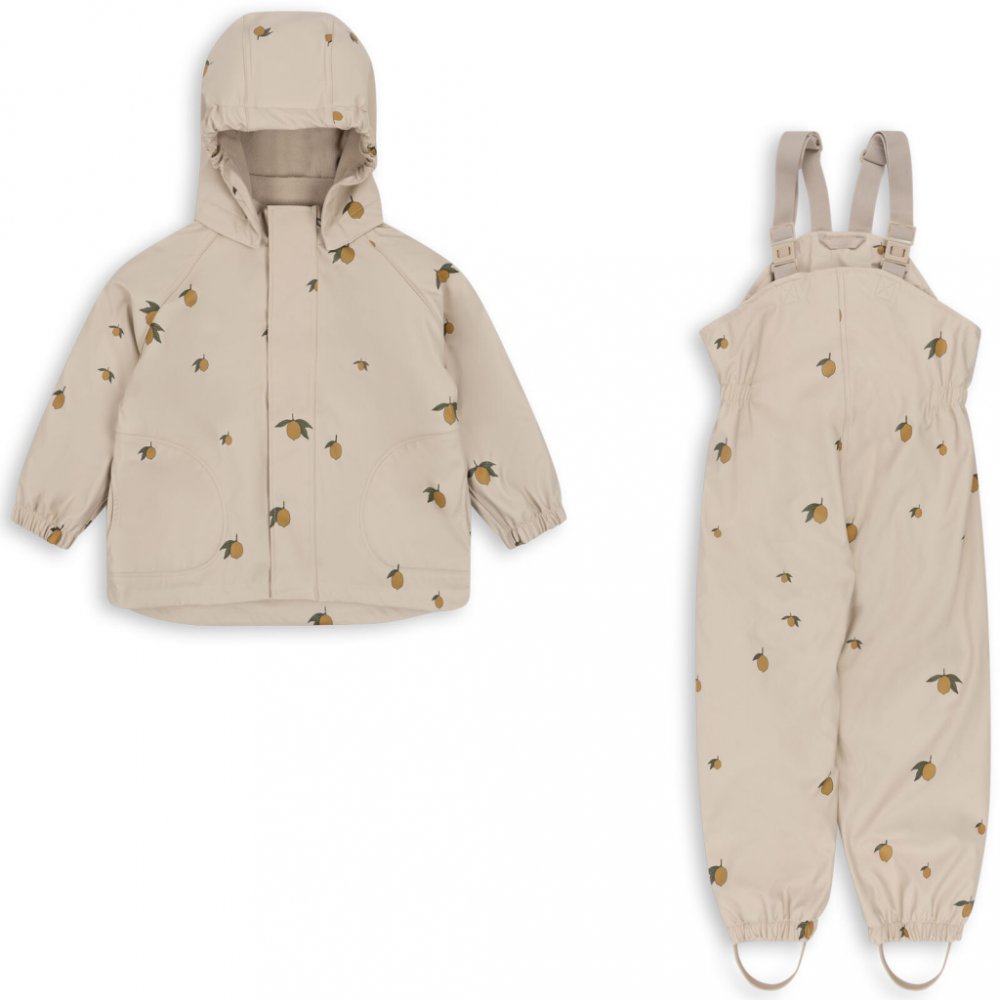 Nádherná větruodolná a voděodolná souprava do deště s hřejivou fleecovou podšívkou uvnitř. Kapuce je odnímatelná se zapínáním na cvoky. Elastické manžety na rukou a nohou zajišťují, že souprava do deště zůstane pevně na svém místě. Bunda má boční kapsy a zapíná se na zip a knoflíky. Bunda i kalhoty mají uvnitř praktické poutko na ramínko.
