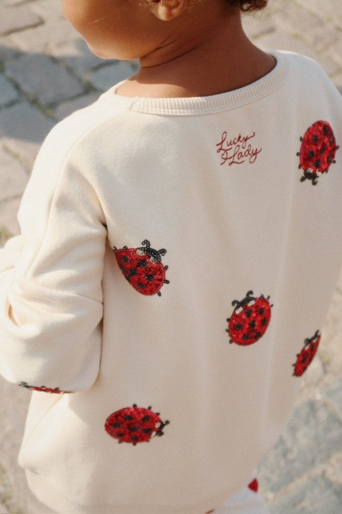 Nádherná dívčí mikina s aplikací berušek z flitrů. Mikina má u krku kulatý výstřih, na rukávech a v pase jsou manžety. Po celé ploše jsou ozdobné z flitrů berušky.