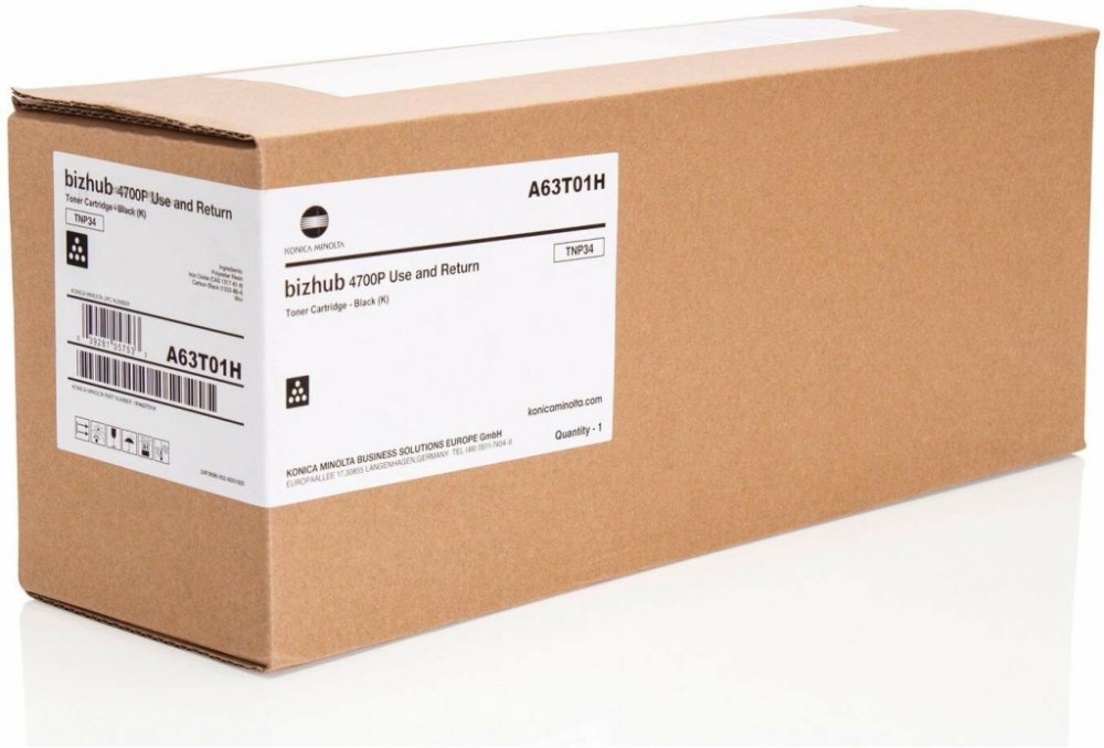 Originální Toner Konica Minolta TNP-34 (A63T01H), Vytiskne 20000 stran při 5% pokrytí. Kompatibilní tiskárny: Konica Minolta Bizhub 4700P. Barva náplně: černá.