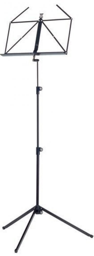Ocelový notový stojan v černém barevném provedení. 3-kusová skládací konstrukce je vyrobena v teleskopickém designu s trojnožkou a sklopnou notačním plochou s rozměry 435 x 215 mm. Má nastavitelnou výšku od 625 mm do 1 240 mm a hmotnost 1,24 kg. Po složení je jeho délka 490 mm.