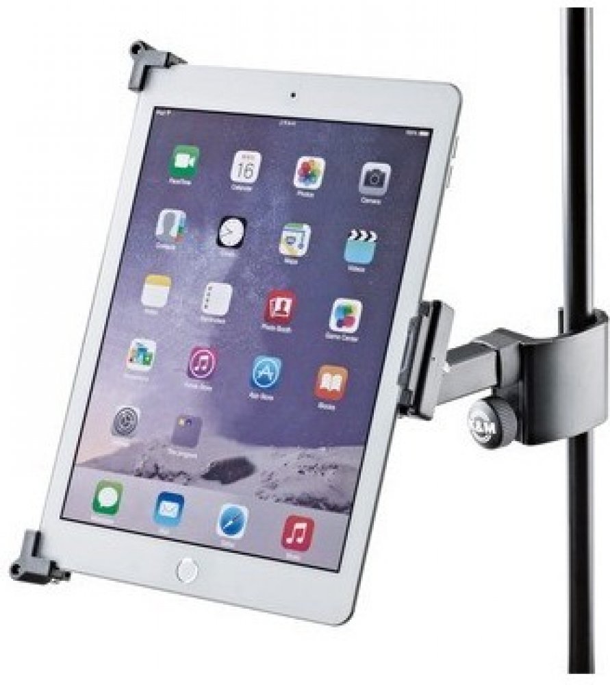 Univerzální držák pro tablet/iPad se snadným a rychlým uchycením k jakémukoliv stojanu s průměrem do 30 mm. Použití na jevišti, ve zkušebně i v domácích podmínkách. Pro tablety a iPady výšky 220/331 mm a šířky 128/232 mm (např.iPad, iPad Air, iPad Pro, Amazon Fire HDX 8.9, Samsung Galaxy Tab 9.7, Google Nexus 9, Asus Transformer nebo Microsoft Surface a Surface Pro). Hloubka tabletu může být od 5 do 11 mm. Nastavení úhlu náklonu, možnost plynulého nastavení do horizontální i vertikální polohy. Vyrábí se v černé barvě.
