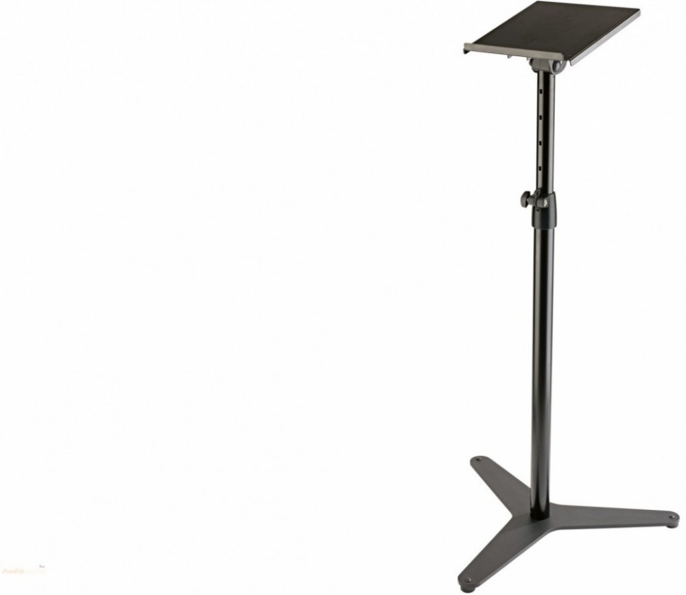 Stabilní ocelový stojan pro studiové monitory s trojnohým podstavcem a naklápěcí nosnou deskou. Podstavec je opatřený plstěnými podložkami pro filtraci hluku. Plocha pro monitor je polohovatelná s možností naklonění o 12,5°. Hloubka desky 45 mm. Postupné nastavení výšky pomocí upínací páky po intervalech 50 mm do 10-ti pozic. Výška stojanu 800/1300 mm. Nosnost 35 kg. Vyrábí se v černé barvě.