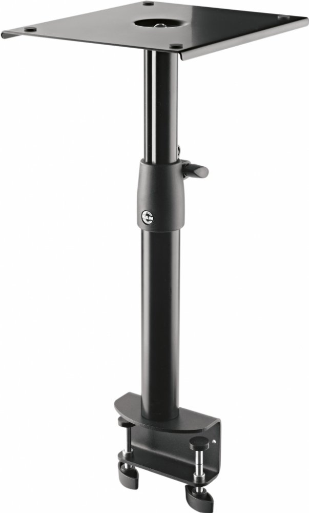 Výškově nastavitelný stojan na monitor se stolovou svorkou pro near-field monitory. Pevná kovová konstrukce s velkou nosnou deskou (205 x 245 mm) je vhodná pro širokou škálu monitorů a jiných zařízení ve stejné velikosti. Praktická stolní svorka umožňuje připevnění na stolové desky o tloušťce 10 až 52 mm. Individuální nastavení výšky je možné v 6 krocích od 335 do 485 mm. Z hlediska nosnosti je možné centrické zatížení až 25 kg. Nosnou desku lze otáčet o 360° pro dokonalé vyrovnání. Gumové podložky jsou součástí dodávky pro bezpečnou, hluk izolující podporu monitorů.
