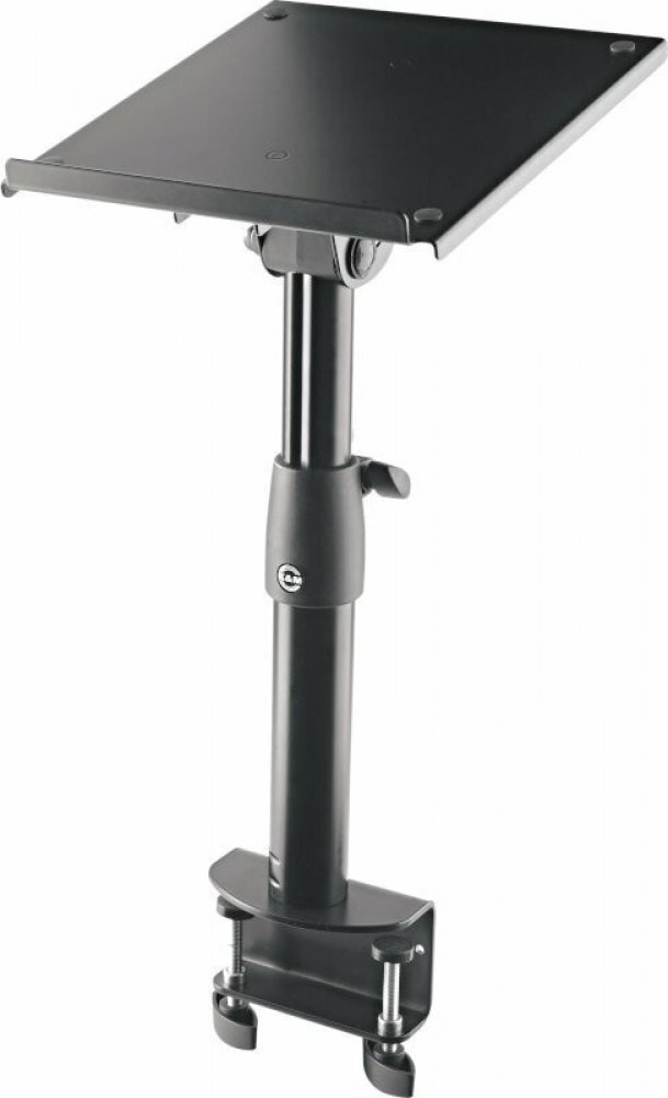 Výškově nastavitelný stojan na monitor se stolovou svorkou pro near-field monitory. Pevná kovová konstrukce s velkou nosnou deskou (230 x 250 mm) je vhodná pro širokou škálu monitorů a jiných zařízení v této velikosti. Desku lze plynule naklánět až o 12,5° a posouvat pro optimalizaci těžiště. Dorazová lišta zajišťuje potřebnou bezpečnost a zabraňuje sklouznutí monitoru. Praktická stolová svorka umožňuje připevnění na desky o tloušťce 10 až 52 mm. Individuální výšku lze nastavit ve 4 krocích mezi 335 a 435 mm. Z hlediska nosnosti je možné centrické zatížení až 25 kg. Nosnou desku lze otáčet o 360° pro dokonalé vyrovnání. Gumové podložky jsou součástí dodávky pro bezpečnou, hluk izolující podporu monitorů.