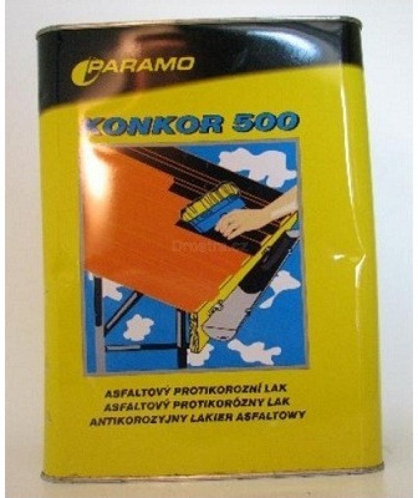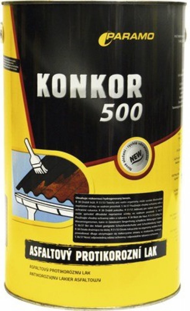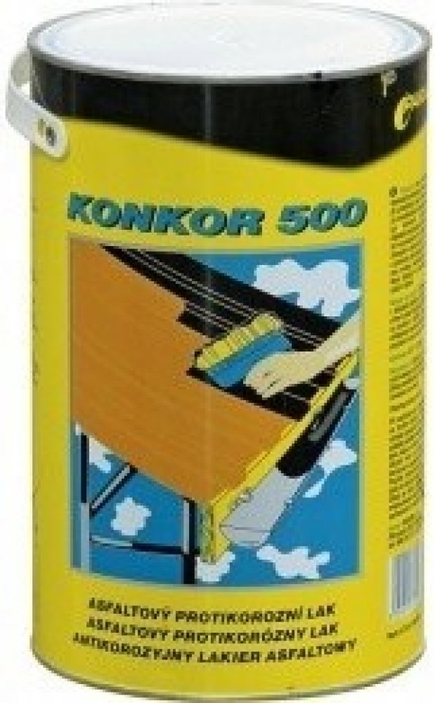 KONKOR 500 asfaltový protikorozní lak 3,5kg.Použití: obsahuje protikorozní přísadu, proto se využívá jako protikorozní nátěr kovových předmětů a konstrukci pro vnější použiti. Nevhodný pro nátěry materiálů z ušlechtilých kovů (měď, hliník, pozink aj.). Zpracování: asfaltový lak se zpracovává za studena. Pro aplikaci se používá štětec nebo pokrývačský kartáč. Možný je i nástřik nebo máčeni. Před použitím je důležité obsah důkladně promíchat. Spotřeba je závislá na způsobu aplikace: 0,3 – 0,5 kg/m2. Skladuje se v uzavřených obalech v krytých prostorách. Obaly s laky nesmi byt vystaveny zvýšeným teplotám nebo přímému slunečnímu zářeni. BH