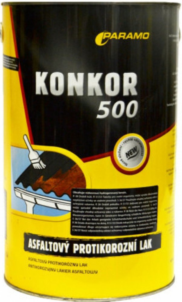 Konkor 500 asfaltový antikorozní lak 9kg POPIS: Asfaltový protikorozní lak KONKOR 500 je roztok oxidovaného asfaltu ve vhodném arganickém rozpouštědle s přídavkem protikorozní přísady. Obsahuje protikorozní přísadu, proto se využívá jako protikorozní nátěr kovových předmětů a konstrukci pro vnější použiti. Nevhodný pro nátěry materiálů z ušlechtilých kovů (měď, hliník, pozink aj.). POUŽITÍ: Zpracování: asfaltový lak se zpracovává za studena. Pro aplikaci se používá štětec nebo pokrývačský kartáč. Možný je i nástřik nebo máčeni.