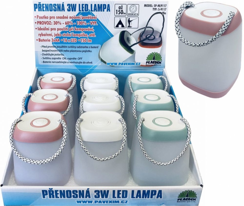 3W LED přenosná lampa, ideální pro použití při kempování, rybaření, jako stolní lampička. 150lm. Provozní režimy: 30% - 60% - 100%. .