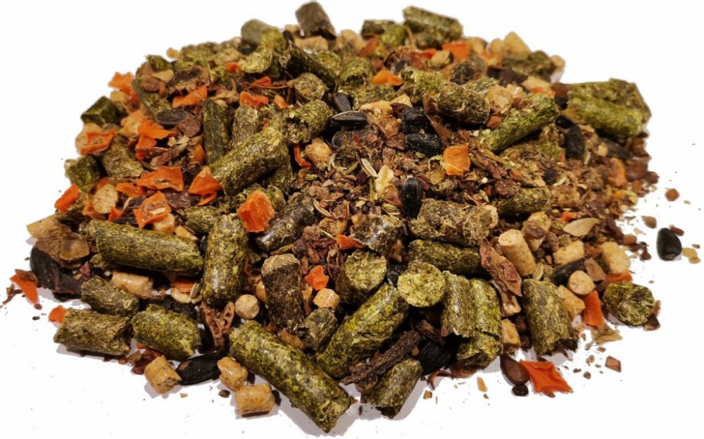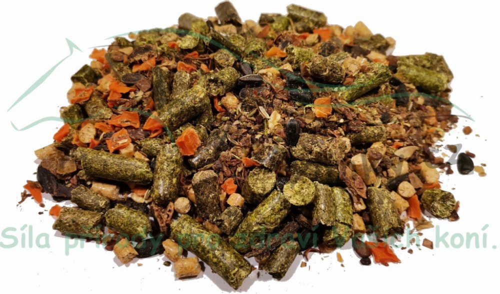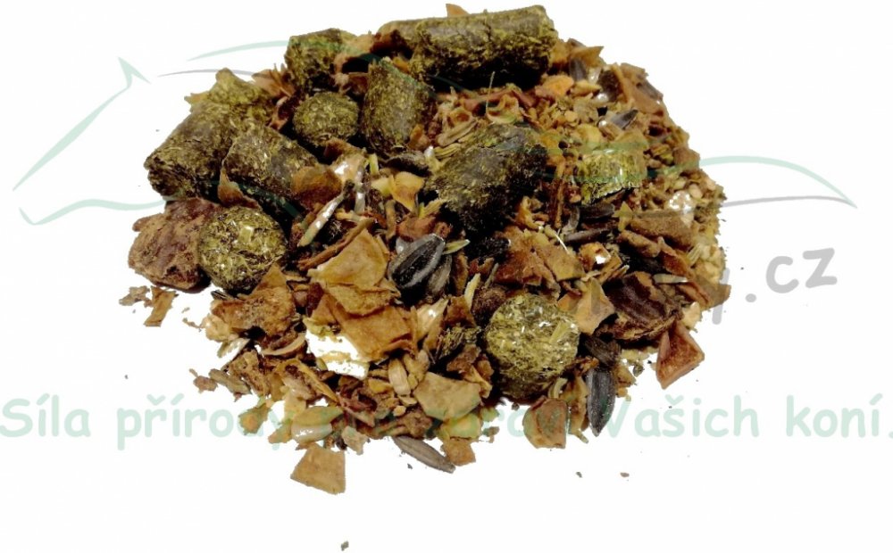 Složení: vojtěška, jablečné výlisky, sójový šrot, slunečnice černá, lněné semínko extrudované, karob hrubý, sušená mrkev, pískavice, fenykl, ostropestřec extrudovaný.