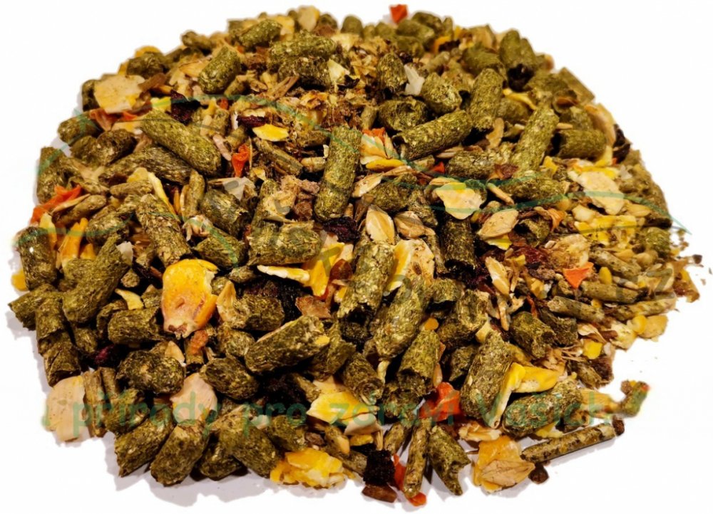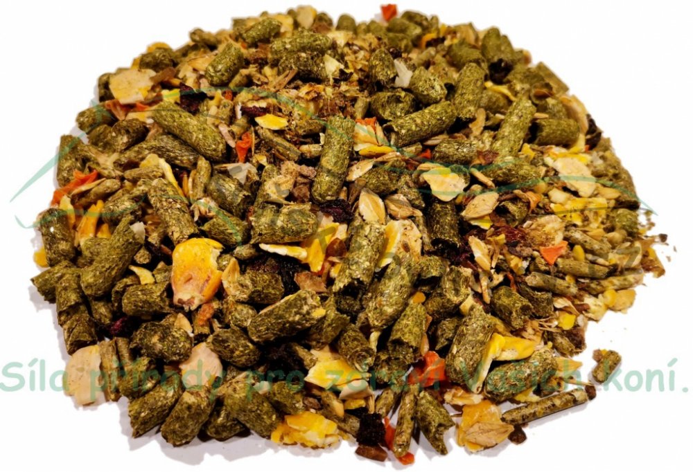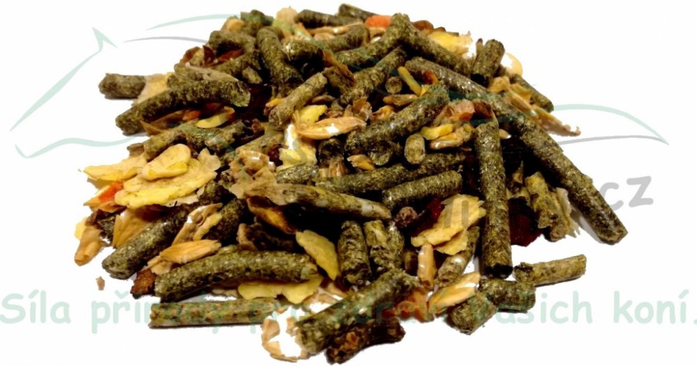 Složení: granulované seno, ječmen, ječné vločky, kukuřičné vločky, jablečné výlisky, vojtěška, hrachové vločky, pšeničné otruby, lněné semeno extrudované, cukrovarské řízky, slunečnicový šrot, sušená červená řepa, sušená mrkev, monokalcium fosfát, chlorid sodný, uhličitan vápenatý.