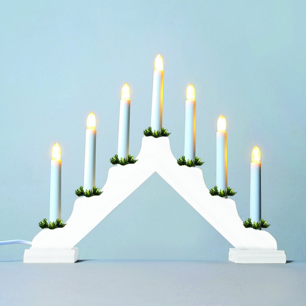 KONSTSMIDE Adventní svícen dřevěný bílý, 7 x čirý LED Filament 34V/0,2W