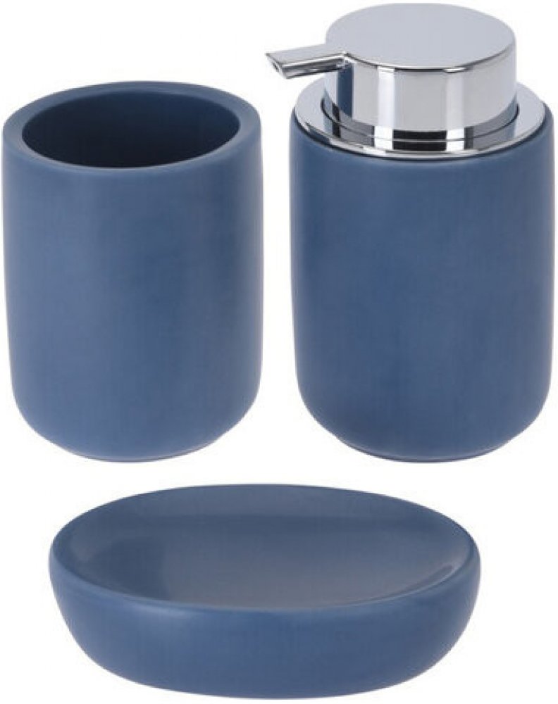 Decentní a nadčasová koupelnová sada obsahuje dávkovač mýdla, kelímek na kartáčky a mýdlenku. Sada je vyrobena z kameniny s matným povrchem příjemné modré barvy. Sada obsahuje: