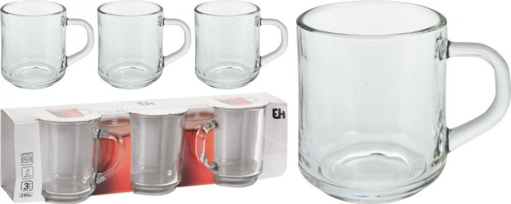 Sada tří sklenic o objemu 240 ml, vyrobených z kvalitního skla. Praktická a estetická sada, ideální pro servírování čaje nebo kávy.