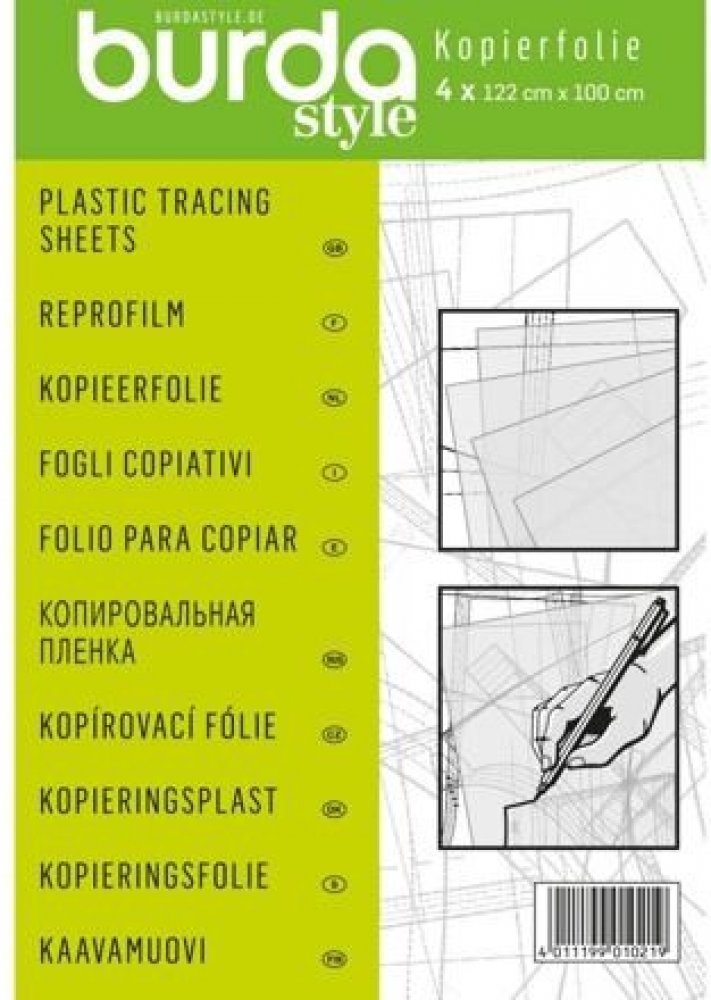 Kopírovací fólie - Burda Vám umožní snadné a hlavně rychlé překreslování střihů. Jedná se o tenký, průhledný tvarovatelný film z odolného materiálu, na který můžete efektivně překreslovat či upravovat střihy. Obsah balení: 4 ks folie Rozměry papíru: 122 x 100 cm Postup při kopírování: Fólii položíme na střihovou přílohu (střih) a na okraji archu pro jistotu přilepíme lepicí páskou, aby se neposunovala. Překreslovacím fixem nebo voděodolným popisovačem obtáhneme na fólii všechny kontury střihu, záševky, značky, šipky určující směr vlákna, číselné značky a popisy atd. Vykopírovaný střih porovnáme s přehledem střihových dílů. Střih vykopírovaný na fólii můžeme snadno vyzkoušet na těle, stačí, když okraje jednotlivých dílů slepíme lepicí páskou. Důležité upozornění: U povrstvených látek typu high-tech nebo látek ze syntetických materiálů hrozí, že se barva popisovače obtiskne, proto střihové díly na látku pokládáme vždy nepopsanou stranou.