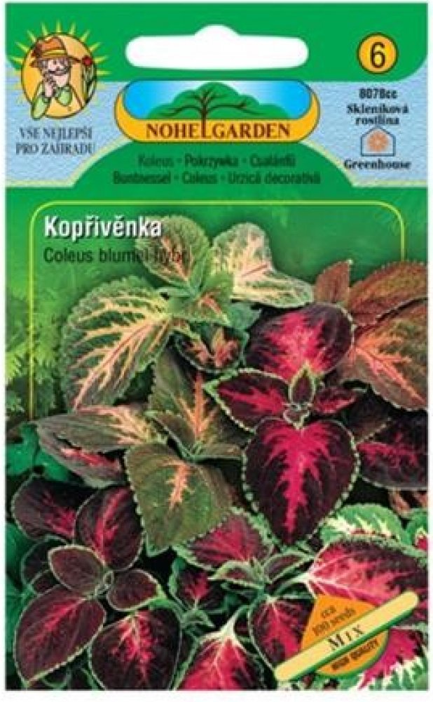 Kopřivěnka mix 0,05 g Okrasná pokojová květina s pestrými listy, vhodná na venkovní záhony, do květníků, truhlíků a jiných zahradních nádob. Osivo klíčí při 18-20°C, rostliny je vhodné předpěstovat v sadbovačích o průměru 6 cm. Rostliny nesnášejí přehnojení dusíkem a jsou velmi citlivé na mráz.