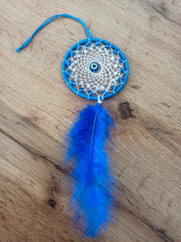 Amulet, který má chránit svého majitele před zlými silami a uhranutím. Modré oko (řecky: mati) je nejen velice krásný korálek, ale má schopnost odrážet veškeré negativní energie, které by nám mohly velice znepříjemnit život. V tomto malém lapači snů naleznete nejen Modré oko, ale i korálky v modré a bílé barvě. Délka: 20cm