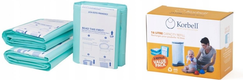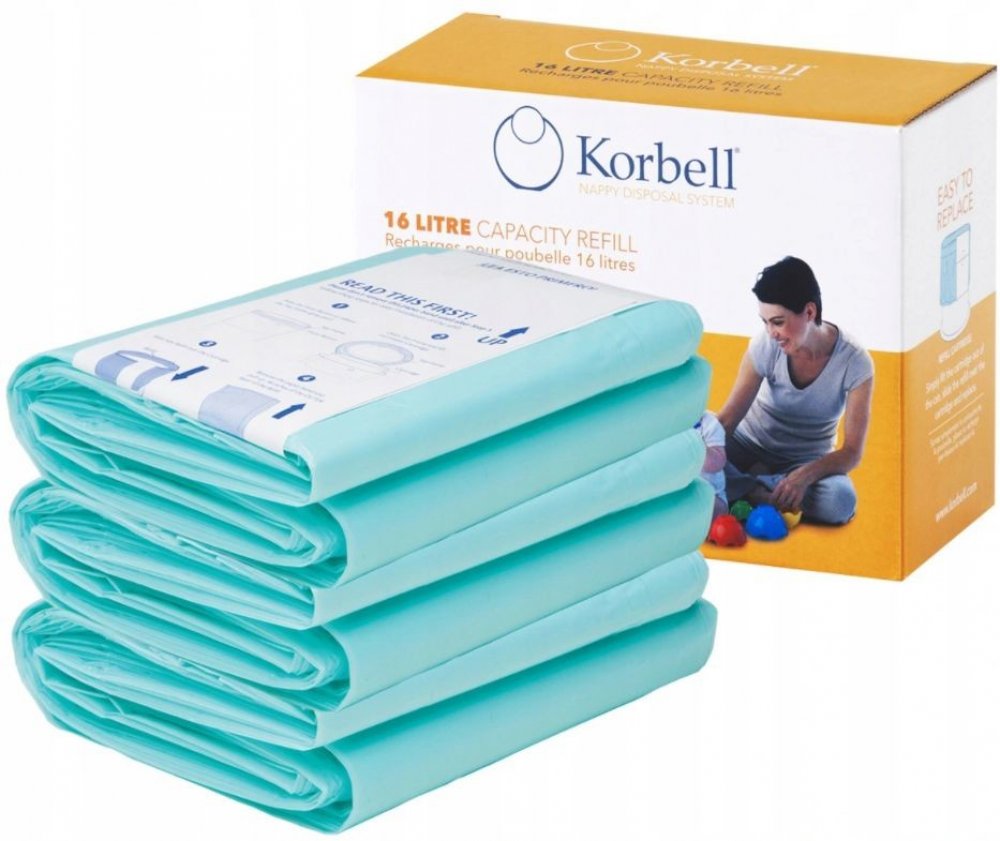 náhradní igelitová náplň do koše Korbell ekologicky rozložitelný pytel (doba rozkladu 9 měsíců až 5 let) Varianty náplň Standard je vhodná do koše Korbell Standard 46 cm a obsahuje 20 pytlů o objemu 16 litrů (na cca 240plen) náplň Plus je vhodná do koše Korbell Plus 52 cm a obsahuje 25 pytlů o objemu 26 litrů (na cca 886 plen pro novorozence nebo 520 větších plen)