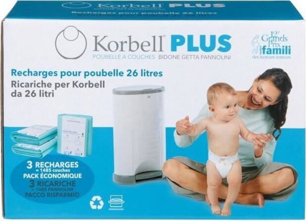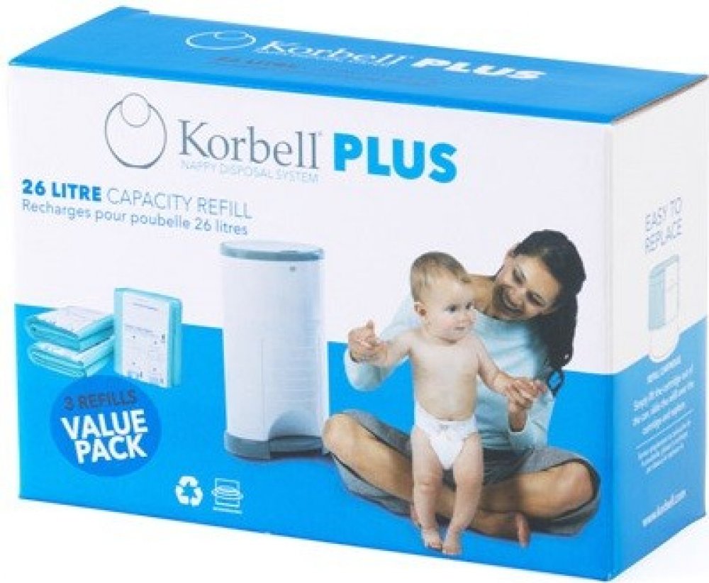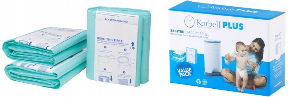 Ekologická vyměnitelná náplň do koše na pleny Korbell PLUS. Sáčky na použité pleny KORBELL jsou pružné a pevné. Jsou 100% biologicky rozložitelné a z 20 % jsou vyrobeny z recyklovaných materiálů.